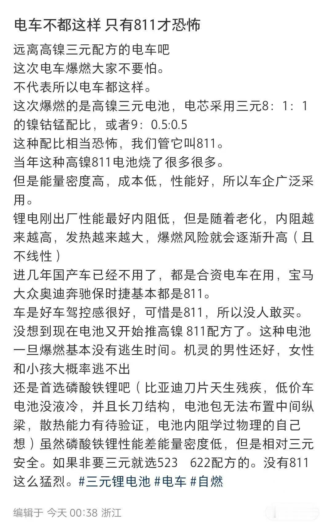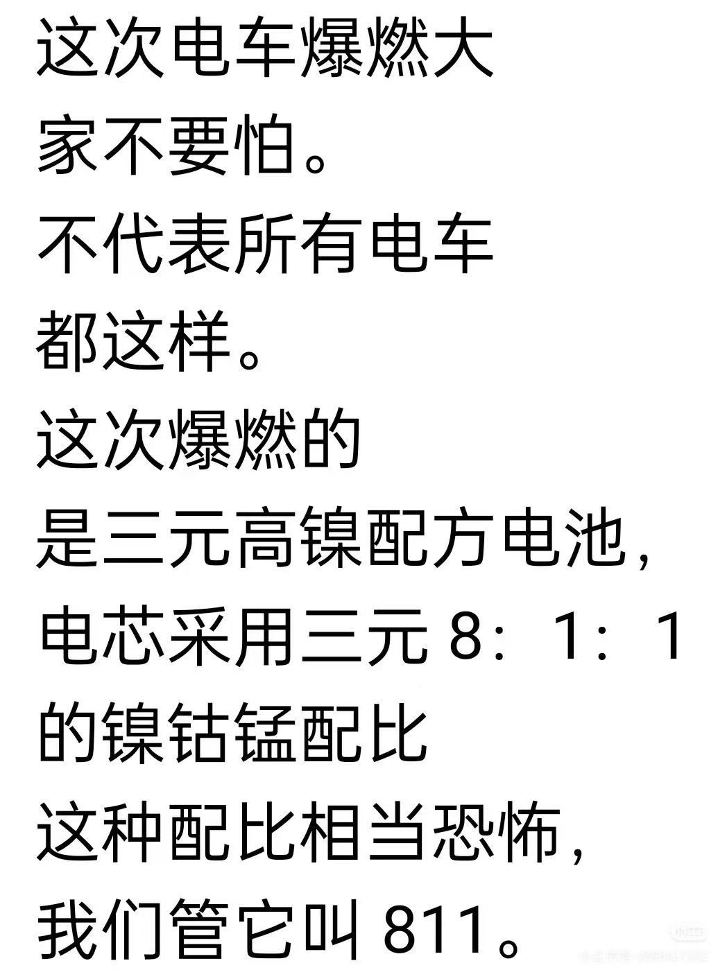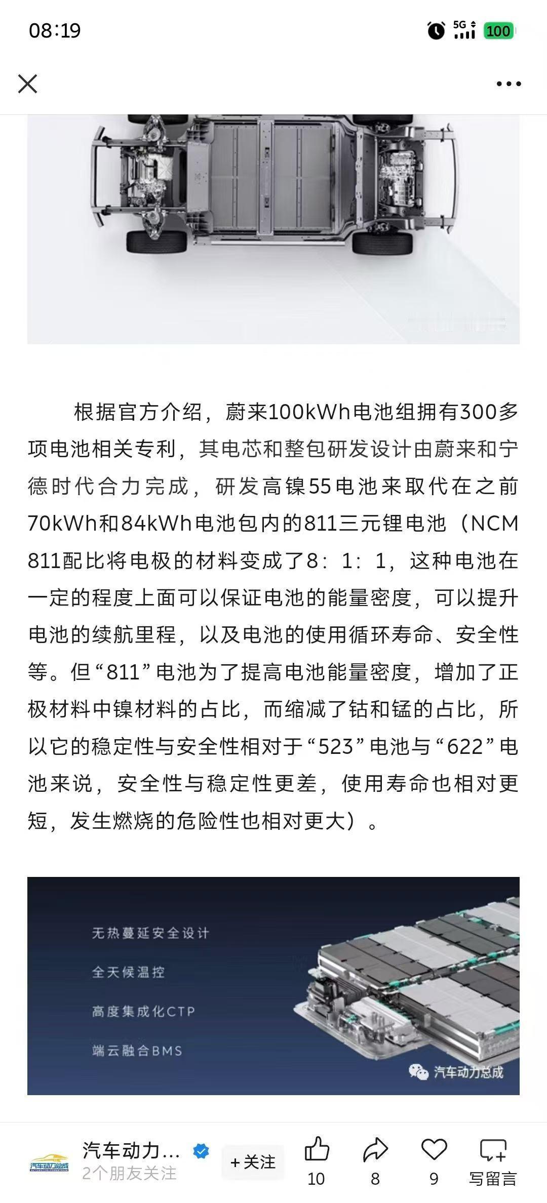 来,关于电池爆燃的知识普及,关心电车的都应该看看。首先是811电池到底是什么意思,为什么811配比容易爆燃。还有蔚来到底采用的是什么配比,好在哪。在此我要批评一下蔚来,咱就是说要不然把自己的电池拿出来展示一下,四百伏的75/85/100/150(半固态),到九百伏的102/120电池。给大伙儿展示一下怎么做到能量密度如此高又安全的。蔚来的102度电池,重量545kg,150度半固态,575kg,这个数值放在哪儿都是顶尖玩意,关键这还没算上每次换电的自检。