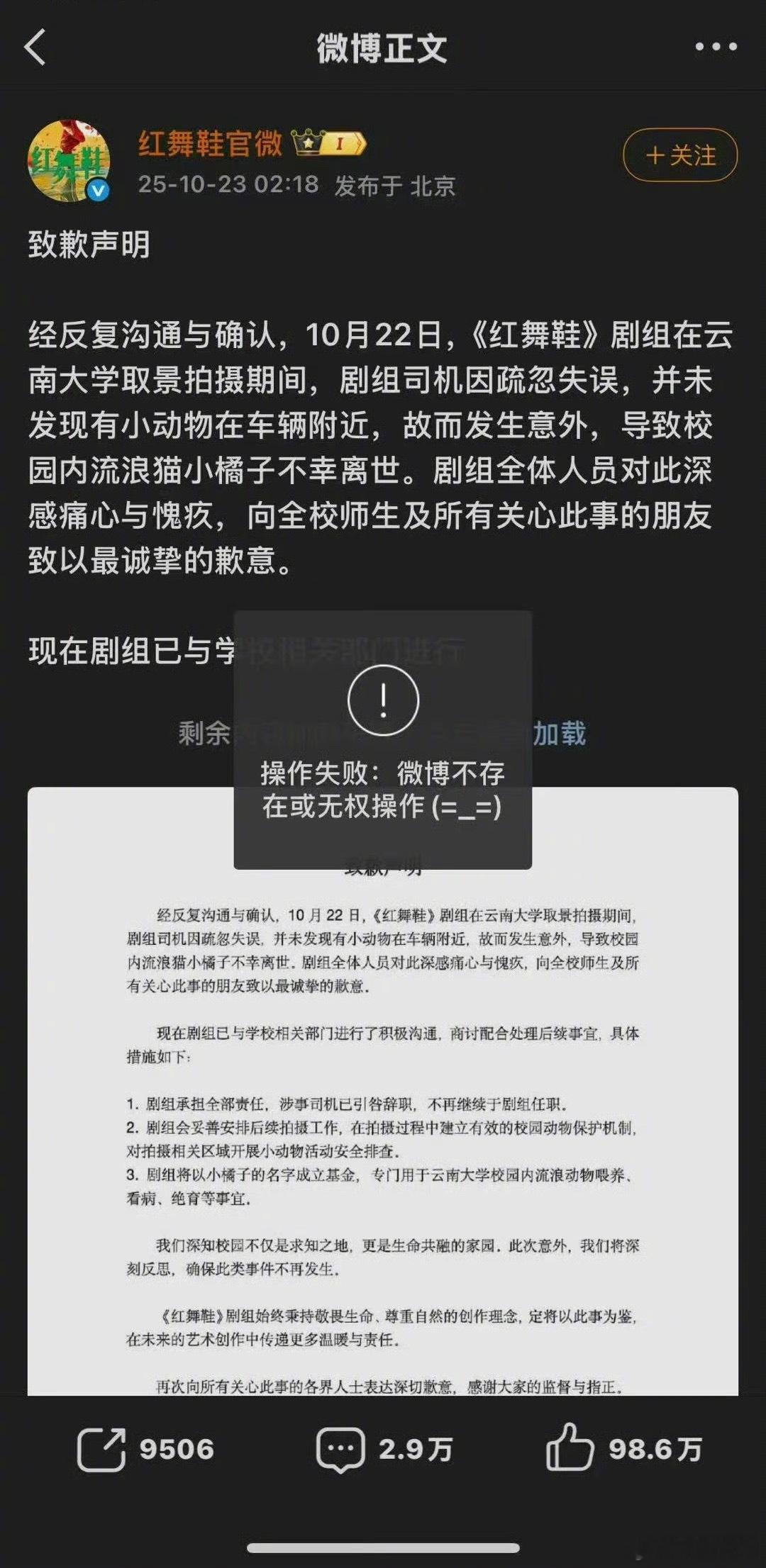 《红舞鞋》官博把剧组在校园里撞死猫的道歉声明删了