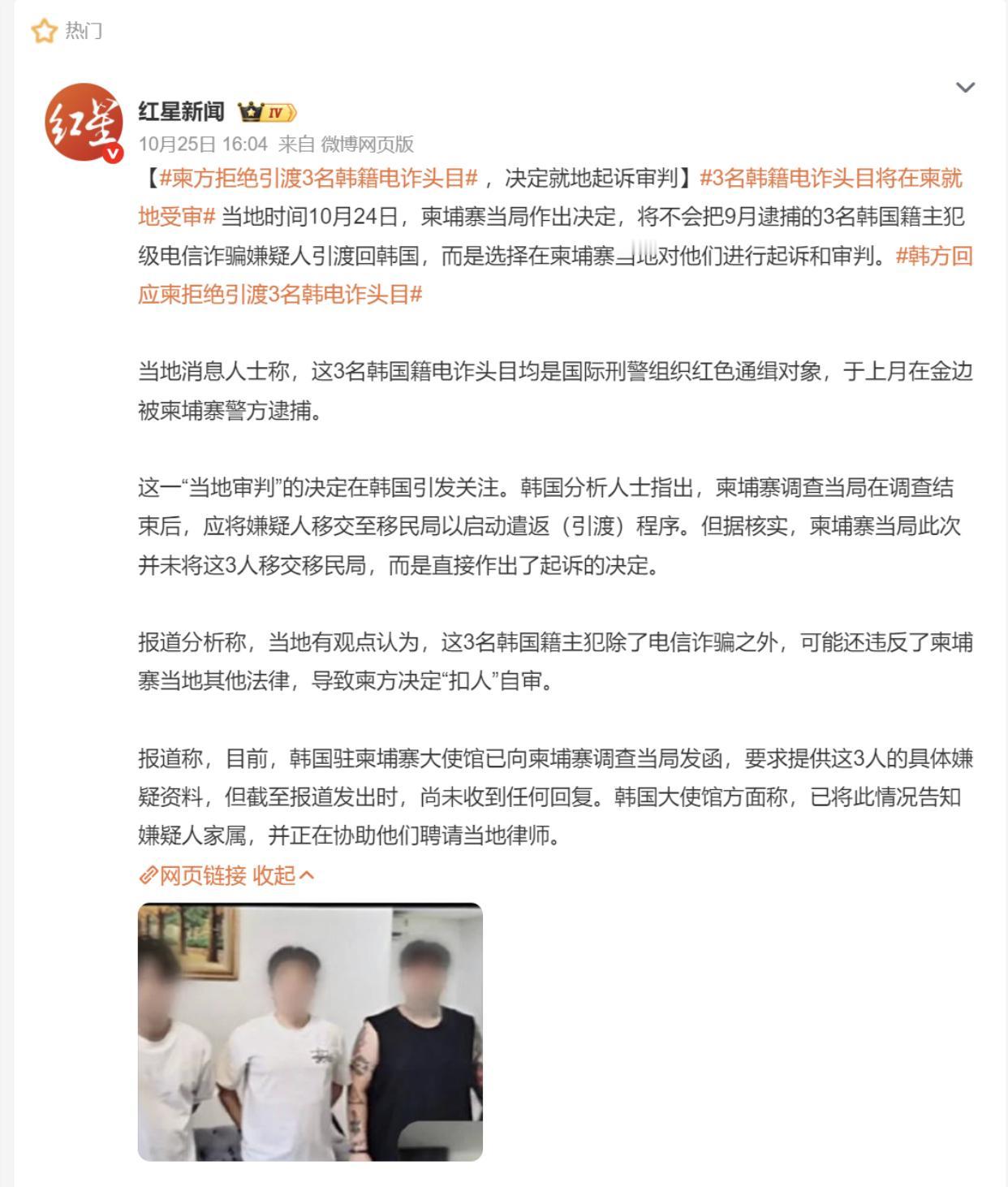 柬埔寨方面拒绝引渡3名韩国籍电诈头目去韩国,而是选择就地起诉和审判。 韩吹:“