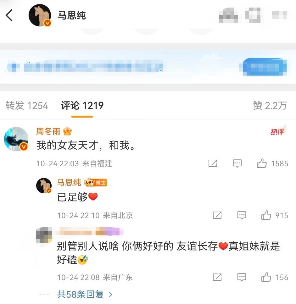 马思纯:我,和我的天才女友。 周冬雨:我的女友天才,和我。 马思纯:已足够。 网友:别管别人说啥,你俩好好的,友谊长存,真姐妹就是好磕…… 嗯,没错,真姐妹就是好磕!有没有发现?上面的文字内容,信息量大大的呀! 呵呵,你们get到了什么呢?
