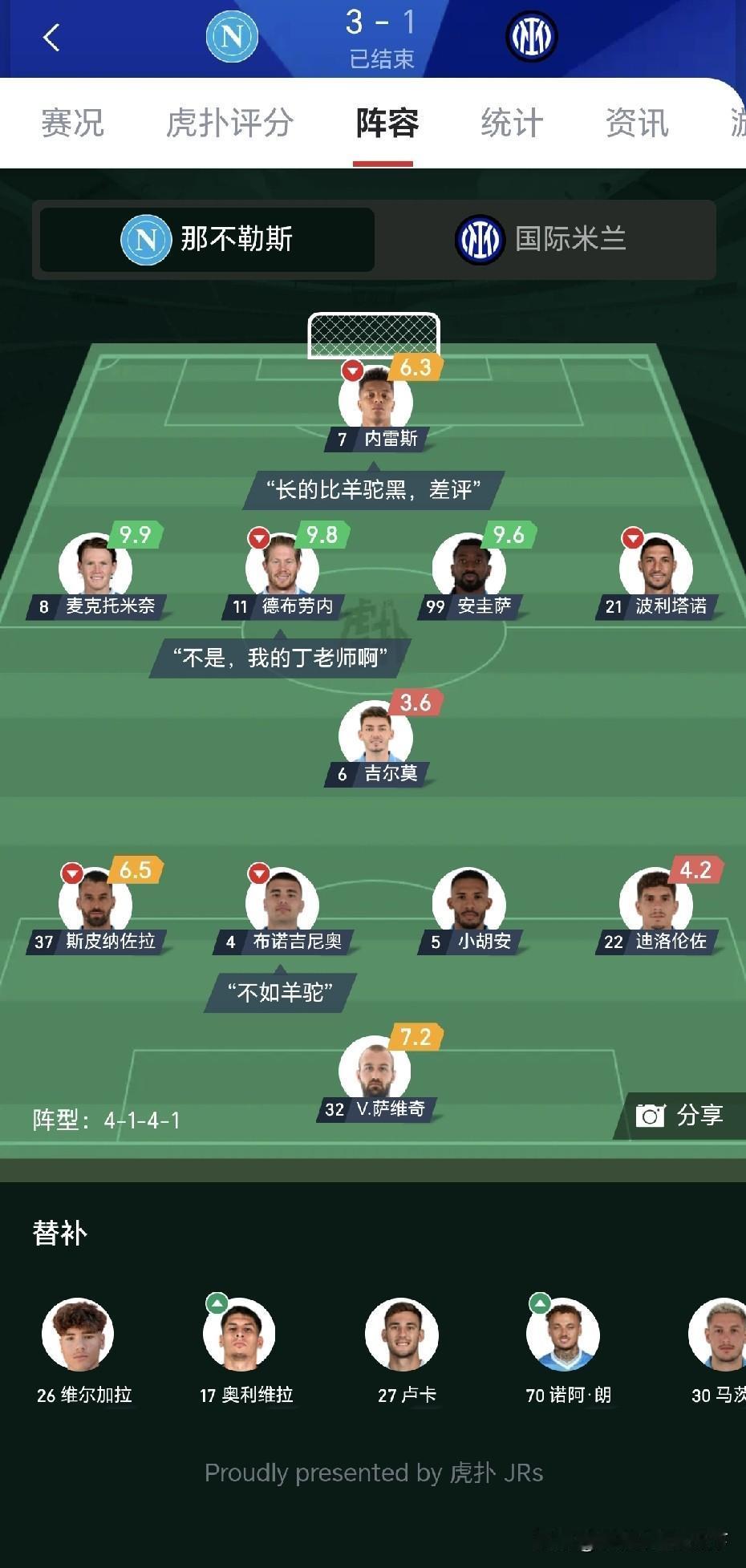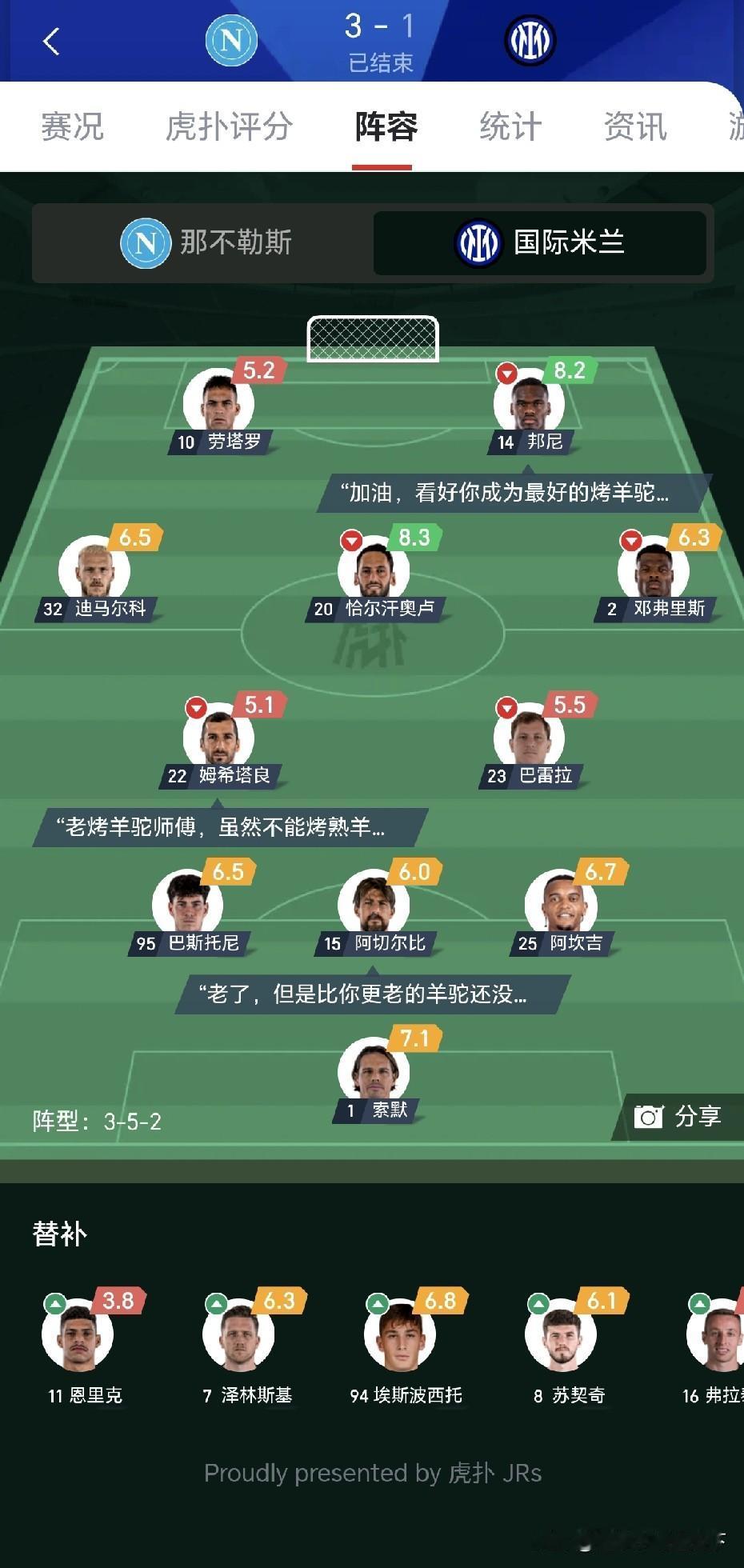 孔蒂还真是欧冠唯唯诺诺,意甲重拳出击啊!国米也真是不争气,那波利欧冠输2-6,国际米兰竟然赢不了那波利? 本赛季国米赢的真正强队只有罗马!而且赢得也很艰难。对阵尤文、那不勒斯都输了,不得不说齐沃关键比赛确实差点意思。 其实这场国米上半场状态很好,然后就有一个莫须有点球落后了,后防今天状态都不好,劳塔罗上半场还行,下半场明显跑不动了,其实博尼不应该下。 国米的后防老化太严重了,今年还是认清点现实比较好,争冠估计有点困难,还是保个前四吧!