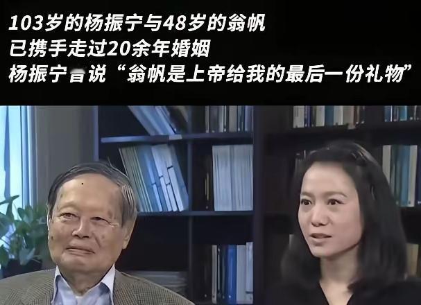 杨振宁20年前说“几十年后大家会觉得这是段好罗曼史”,现在看真没说错,非议早少了,更多人懂了其中的珍贵。 哪是什么单方面依附?翁帆21年里读成清华博士,眼里始终有光;而结婚前还发着高烧、脸色蜡黄的杨振宁,能活到103岁,全靠她悉心照料。他称她是“上帝的礼物”,她说是他给了“象牙塔”,这明明是彼此滋养。 太多人纠结年龄差,却忘了婚姻的本质是灵魂相惜。他一句“多亏有你”,胜过所有世俗评判。你们觉得,好的婚姻是年龄匹配,还是这种相互成就?
