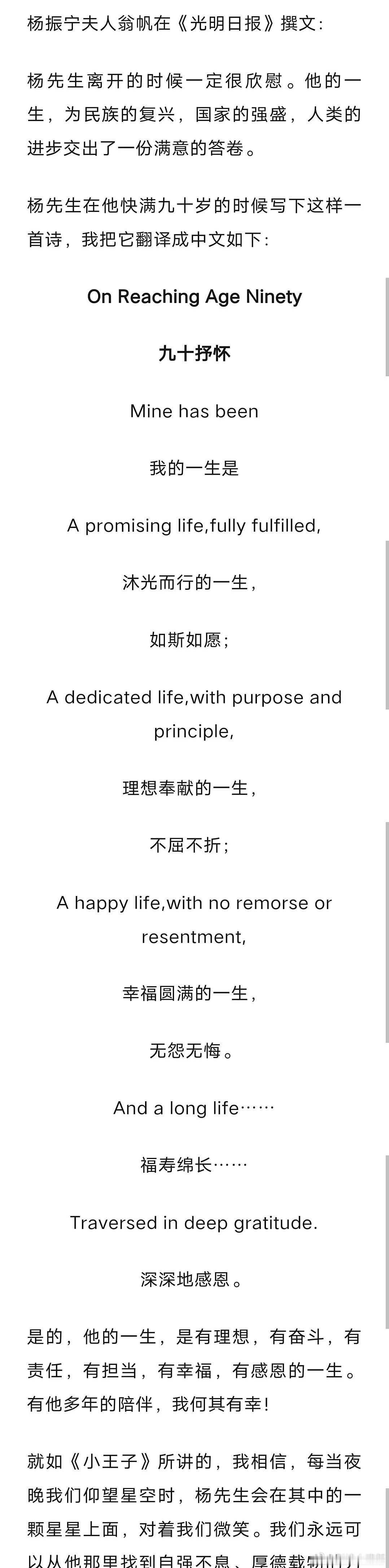 翁帆在《光明日报》发表的悼文,着实令人意外。本以为会是洋洋洒洒的万字长文,细数杨振宁先生的生平点滴,可实际上却简短精炼 。没有冗长的生平铺陈,也无过度的情感宣泄,仅借一首译诗和几句肺腑之言,就精准地概括了杨振宁先生的一生,字里行间尽显克制与清醒,这种别具一格的表达,反倒更具力量。