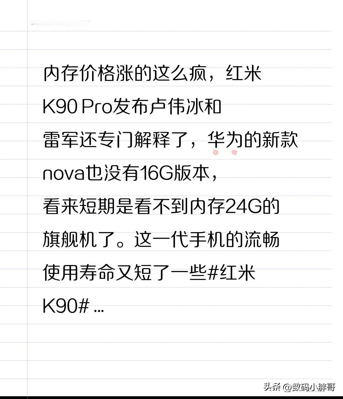 内存价格涨的这么疯, 红米K90 Pro发布卢伟冰和雷军还专门解释了, 华为的新款nova也没有16G版本, 看来短期是看不到内存24G的旗舰机了。 这一代手机的流畅使用寿命又短了一些[狗头] 红米 K90 华为nova 15