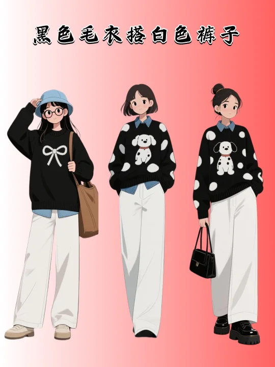 黑色毛衣不管是带可爱图案还是简约款,配白色阔腿裤都高级感爆棚,日常穿慵懒又时髦,出街随便拍都像时尚画报~