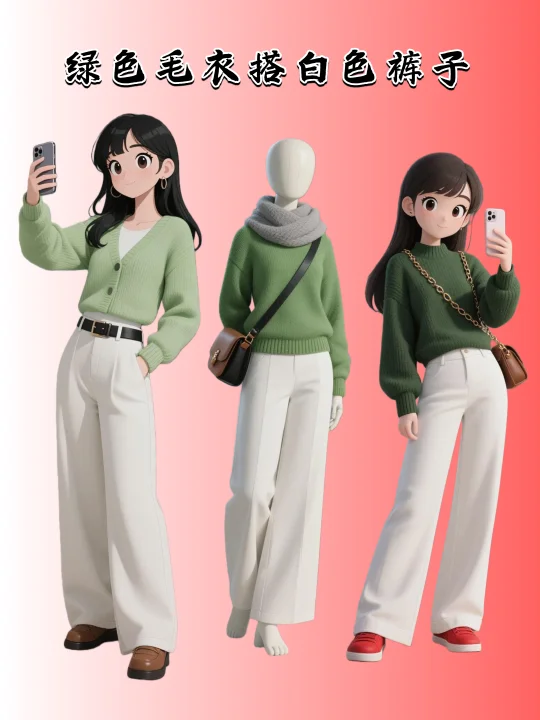 搭配白色裤子,清新又有质感,不管是浅绿开衫还是深绿毛衣,配白色阔腿裤都很有活力,秋天穿这套去公园散步,氛围感绝了~