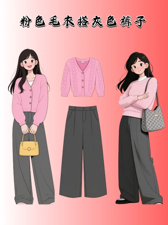 粉色毛衣温柔又甜妹,搭配灰色裤子,中和了甜腻感还多了份知性。