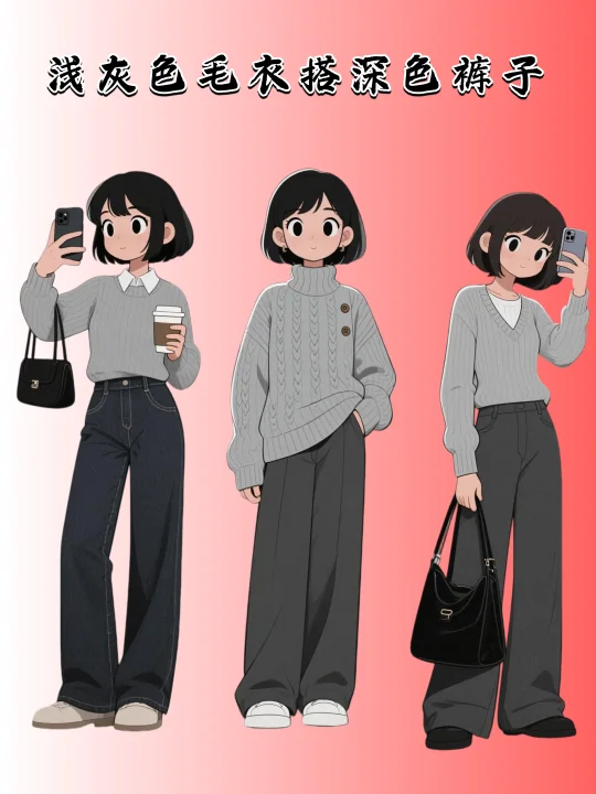 浅灰毛衣配深灰裤子,高级感直接拉满,不管是高领款还是V领款,都很适合走轻熟风或通勤风的姐妹,低调又有品味~