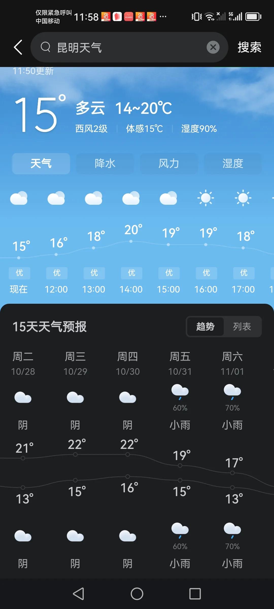 今年的昆明天气感觉跟着了魔是的,整个国庆中秋双节没有晴天,整个十月分也是也雨天,阴天为主战场。都十月底了,还是阴沉沉的,下个月初也是雨天为主。感觉连晴三天五天的今年秋天都难。还是不光昆明,别的地方也比较反常啊!以上仅供参考!