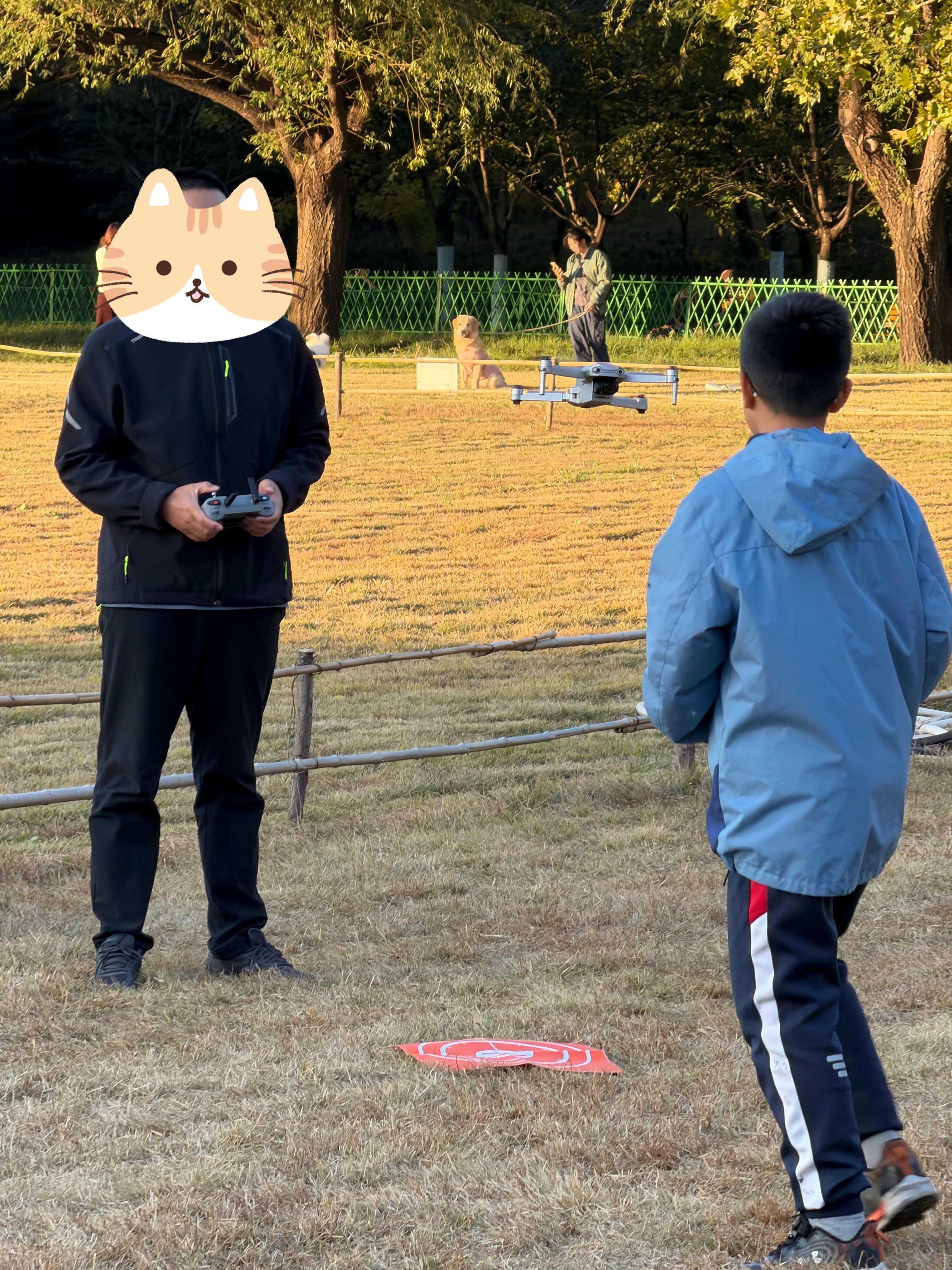 在公园玩有人放无人机,但这爷俩一看就是新手,光起飞就折腾了十几分钟。
