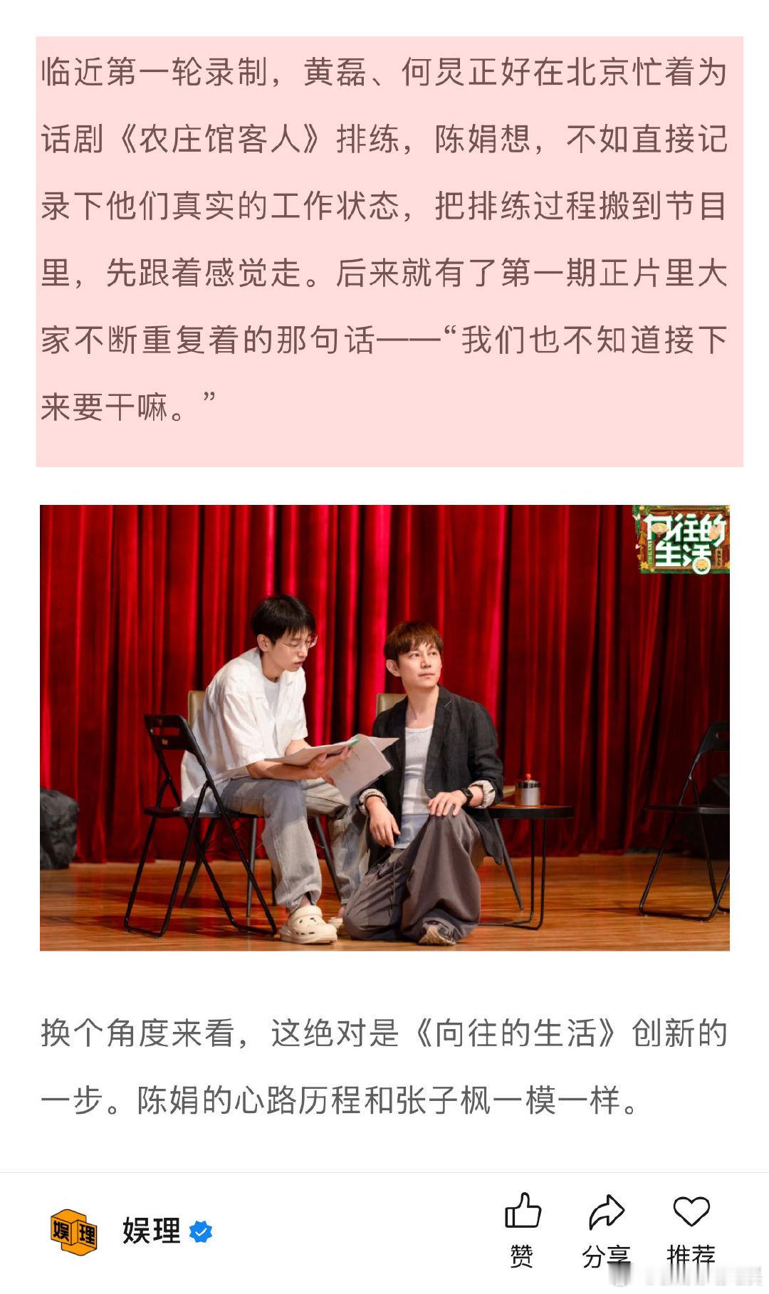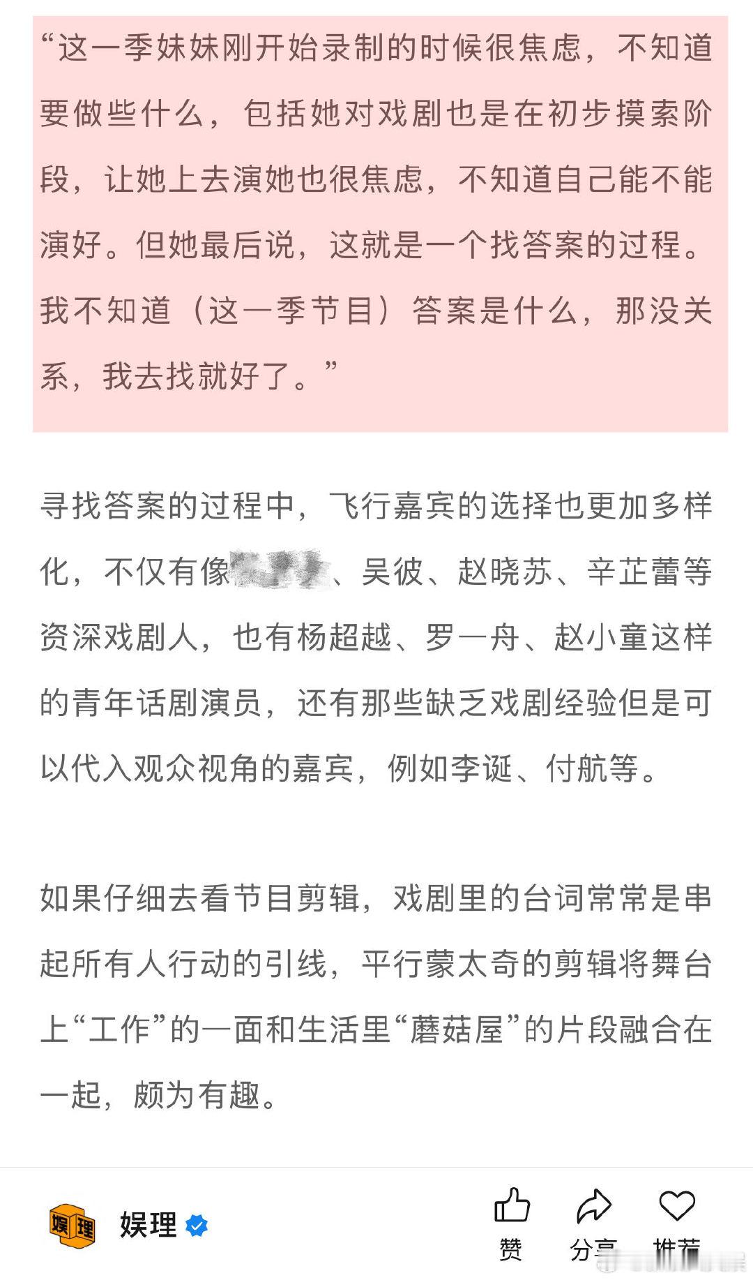 张子枫刚录向往的生活时很焦虑 导演说张艺兴在向往的生活很自律 做“戏剧季”是《向往的生活》创新的一步。总导演陈娟的心路历程和张子枫一模一样。“这一季妹妹刚开始录制的时候很焦虑,不知道要做些什么,让她上去演她也很焦虑。但她最后说,这就是一个找答案的过程。我不知道(这一季节目)答案是什么,那没关系,我去找就好了。”娱理独家↓