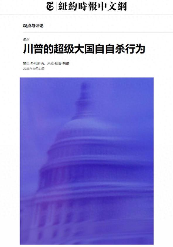 [微风]美国已完全陷入中国的圈套! 纽约时报: 特朗领导的超级大国正在自杀。 自己人捅自己人,往往最狠,也最准。这话放在美国政坛,最近简直是活生生的上演。有民主党在背后撑腰,一向跟特朗普不对付的《纽约时报》,这次更是直接掀了桌子。 10月23日,他们发表了一篇报道,直指“特朗普的超级大国自杀行为”。这可不是什么小报的标题党,而是美国最具影响力的主流媒体,对自己在任总统发出的最严厉警告。 报道里说,特朗普正在亲手拆解二战后美国建立起来的整个盟友体系,而那场轰轰烈烈的贸易战,更是彻底暴露了美国的致命弱点。 在他们看来,这个曾经的超级大国,正在特朗普的带领下,一步步走向“自杀”。 这话说得够重,但并非空穴来风。报道里提到的第一宗“罪”,就是“拆伙”。特朗普上台后,干的第一件大事,就是跟自己的“小兄弟们”算账。 他嫌北约盟友的国防花钱太少,天天在G7峰会上嚷嚷着“美国不再当冤大头”,甚至威胁要退出这个维持了七十多年的军事同盟。他还一意孤行地退出了TPP,那个原本为了在经济上围堵中国而精心设计的跨太平洋伙伴关系协定。 这一系列操作,就像一个大家族的族长,突然宣布“以后各过各的,谁也别想占我便宜”。结果呢?欧洲盟友心里直打鼓,开始琢磨着“欧洲战略自主”;加拿大、墨西哥这些邻居,也被他搞得一肚子火。 美国用几十年时间、无数金钱和信誉建立起来的朋友圈,被他用“美国优先”的大锤,砸得七零八落。 如果说拆散朋友圈只是伤了美国的“面子”,那跟中国打贸易战,可就实实在在捅到了美国的“里子”。 《纽约时报》认为,这场贸易战,就像一面照妖镜,把美国外强中干的本质照得一清二楚。特朗普本以为,加征关税是件“杀敌于无形”的利器,能一拳就把中国打趴下。可结果呢? 关税一加,成本最后还是转嫁到了美国普通消费者的头上,沃尔玛里的商品涨价了,农民的大豆卖不出去了。美国发现自己根本离不开“中国制造”,从手机、衣服到药品,供应链早已深度捆绑。 这记“七伤拳”打出去,中国虽然也疼,但美国自己也是内伤不断。更致命的是,这场战争让全世界看到了,美国这个超级大国,在面对一个坚韧的对手时,并没有太多有效的、不伤及自身的手段。 那么,这跟“中国圈套”有什么关系?其实,中国可能根本没设什么圈套。中国的策略,更像是一种“你打你的,我打我的”太极。 当美国在全球范围内拆伙、退群、到处树敌的时候,中国在干什么?它在默默地填补美国留下的权力真空。 美国退出TPP,中国推动的RCEP(区域全面经济伙伴关系协定)就签了;美国抱怨世卫组织,中国就积极提供疫苗援助,展现“大国担当”;美国在中东搞收缩,中国就深化与中东国家的能源合作。你拆你的庙,我盖我的殿。 美国每退出一个领域,就留下一个战略空白,而中国,往往是那个最合适、也最愿意填补空白的角色。这不是中国挖的陷阱,而是美国自己一步步走进了一个由它自己行为所塑造的、对中国有利的战略格局里。 这就像一场牌局,特朗普一开始就扔掉了所有的“对子”和“顺子”,手里只剩下一堆单张的大王小王,以为能单挑全场。他忘了,打牌不光看牌的大小,更要看牌的组合和配合。 他把盟友这些“对子”都扔了,剩下的单张再大,也容易被别人用组合拳给耗死。而中国,则稳稳地握着一手不算最大但组合极好的牌,耐心地等待着对手出错。 《纽约时报》的“自杀论”,正是看到了这种最危险的迹象:美国正在失去它的“组合优势”,正在从一个体系的领导者,变成一个孤独的、与全世界为敌的挑战者。 这种“自杀”行为,最可怕的地方在于它的不可逆性。信誉一旦失去,就很难再建立起来。当欧洲开始怀疑美国的承诺,当盟友开始寻求自保,当世界看到美国的脆弱,那个曾经一言九鼎的超级大国形象,就已经开始崩塌了。 特朗普或许认为他在“让美国再次伟大”,但在《纽约时报》这些精英看来,他正在掏空美国伟大的根基——那个由盟友、国际规则和经济领导力共同构筑的庞大帝国。 那么,这真的是“自杀”吗?还是说,这只是一场痛苦但必要的“刮骨疗毒”? 特朗普的支持者可能会说,他正在打破一个不平等的旧秩序,为美国争取更实际的利益。但问题在于,当旧秩序被打破,新的、更有利的秩序能建立起来吗? 还是说,美国最终会发现,自己只是砸碎了别人的饭碗,也顺便砸了自己的厨房?在这场关乎国运的豪赌中,你觉得特朗普究竟是在拯救美国,还是在亲手埋葬它的未来?这或许比《纽约时报》的任何一篇报道,都更值得我们深思。