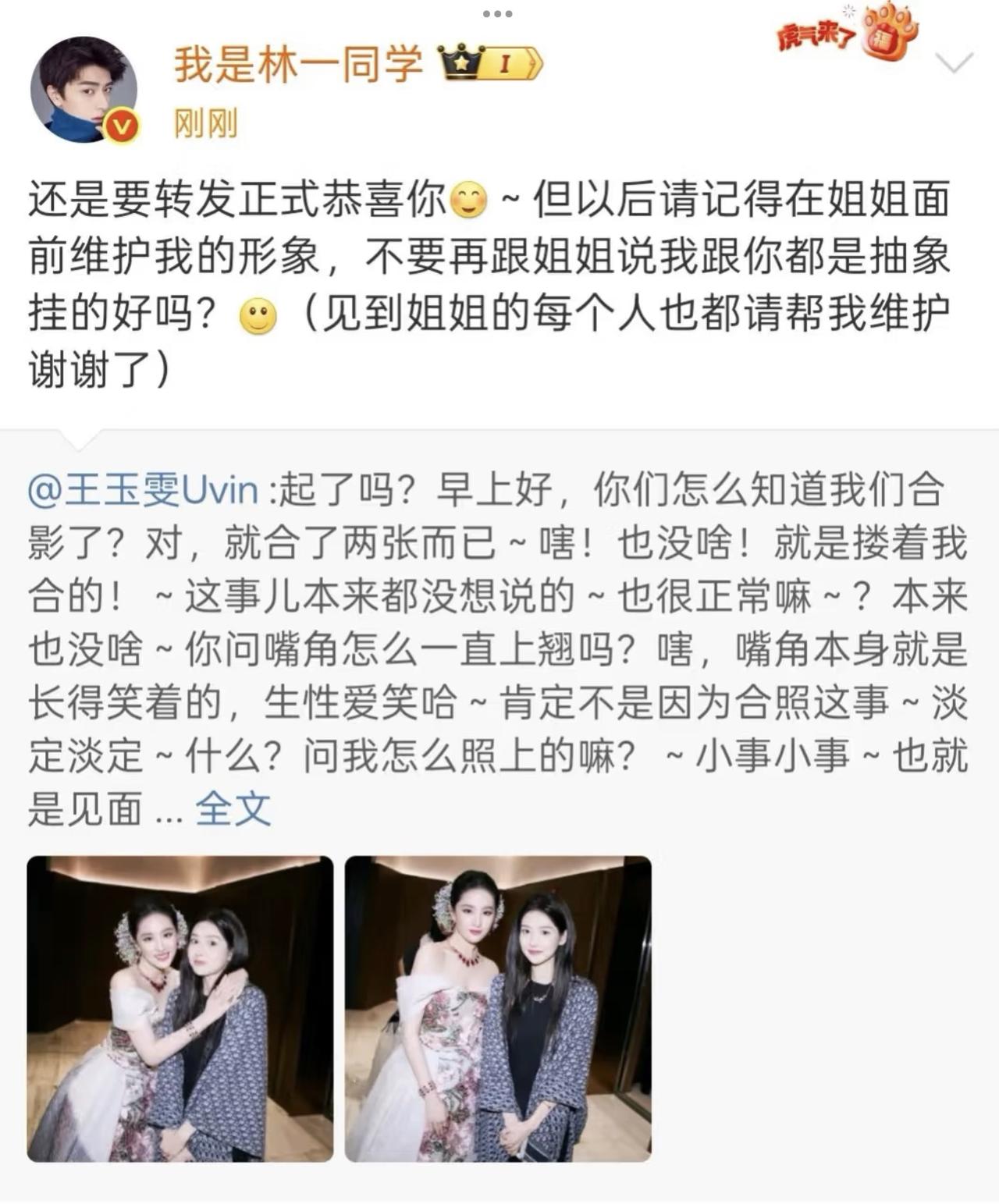 王玉雯和刘亦菲和个照,可把林一忙坏了。 看王玉雯和刘亦菲的合照,真像她社交平台写的那样,连呼吸都紧张。一晚上都回味着她搂着我的状态中。 而王玉雯的抽象朋友林一,知道王玉雯和刘亦菲合照了,还在社交平台辟谣自己不是抽象一挂的,只有和王玉雯在一起的时候才是,让王玉雯维护好自己的形象。但是林一的抽象早已深入人心。 记得之前林一和王玉雯一起录制综艺,林一说和刘亦菲拍摄过电视剧,王玉雯就十分的羡慕。如今王玉雯也和偶像同框了,可喜可贺啊 王玉雯演我追星 刘亦菲