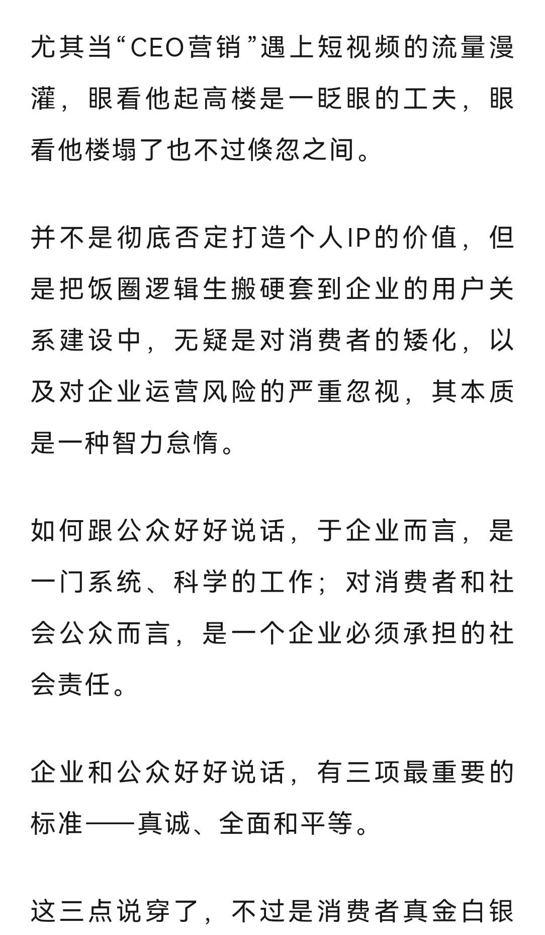 半月谈再谈“网络水军”,CEO营销流量的反噬,看来第一财经揭开的盖子还没到盖上的时候[吃瓜群众] 半月谈公众号今天发文,一部分内容谈及“CEO人设营销”,打造饭圈、豢养粉丝…… “豢养”这个词你听听,它不是个好词。 自第一财经开第一枪以来,正规媒体接连下场,甚至南方系都加入批判的队伍。 可能是某司豢养网络打手已经成规模成组织,引起了上面重视。 现实社会的团团伙伙成规模是露头就打,网络上的团伙其实危害性更大。 某些黑水军要注意了,别进去了。