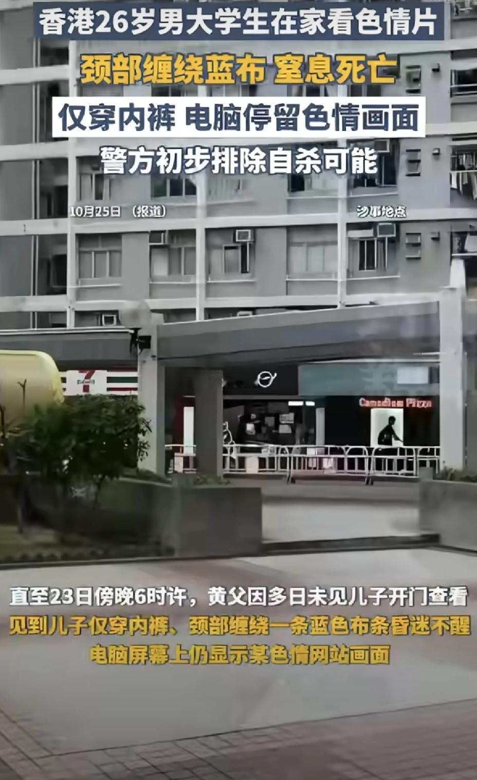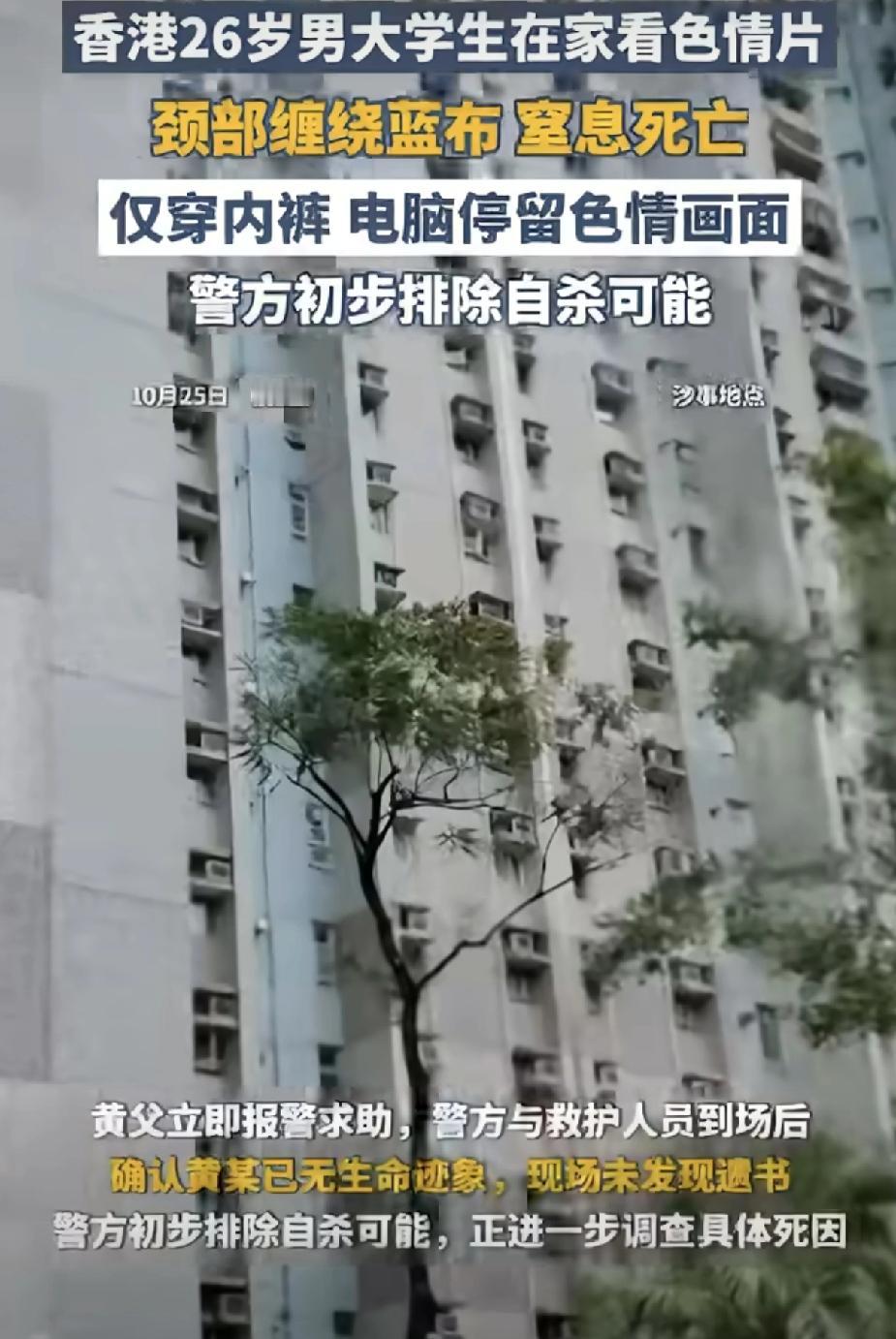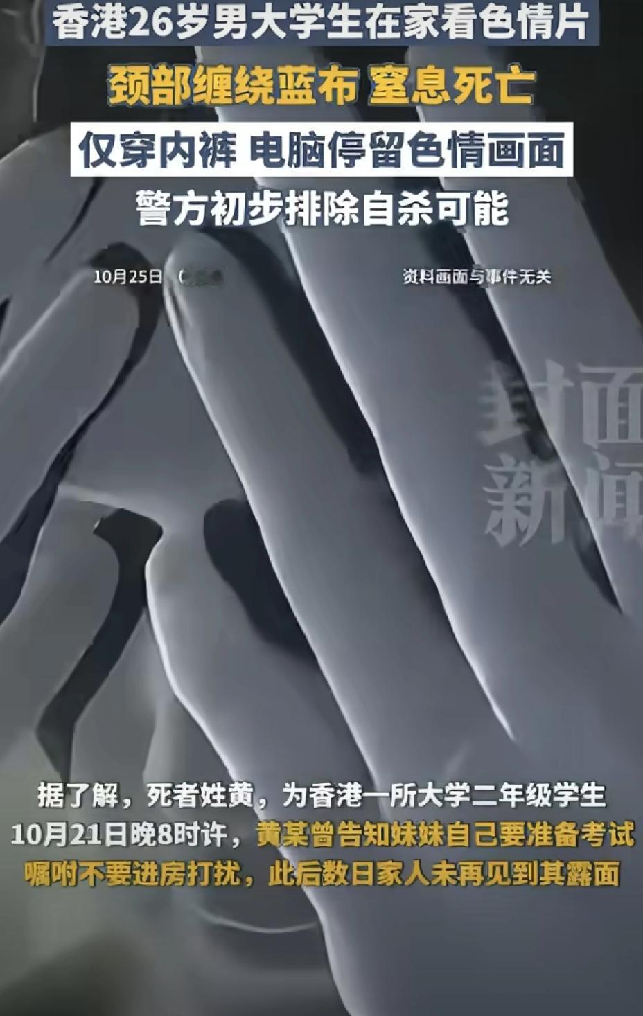 香港一26岁男大特意跟家人说要复习,让家人别打扰自己,随后把自己锁在房间里。直到三天后,爸爸推门进去发现人已经凉了,电脑上还放着色情内容。据说男大拿着布条缠着脖子进行观看的,导致窒息身亡。但是实在搞不懂观看这玩意为啥要拿布条缠着脖子,难道是感觉更强烈? 真是硬生生的把自己给玩没了。不过,这男大都不饿吗,期间都不出来吃饭[what]。还有,同一个屋檐下,几天不见他出来,家人都不去看一眼,这心也是挺大的。