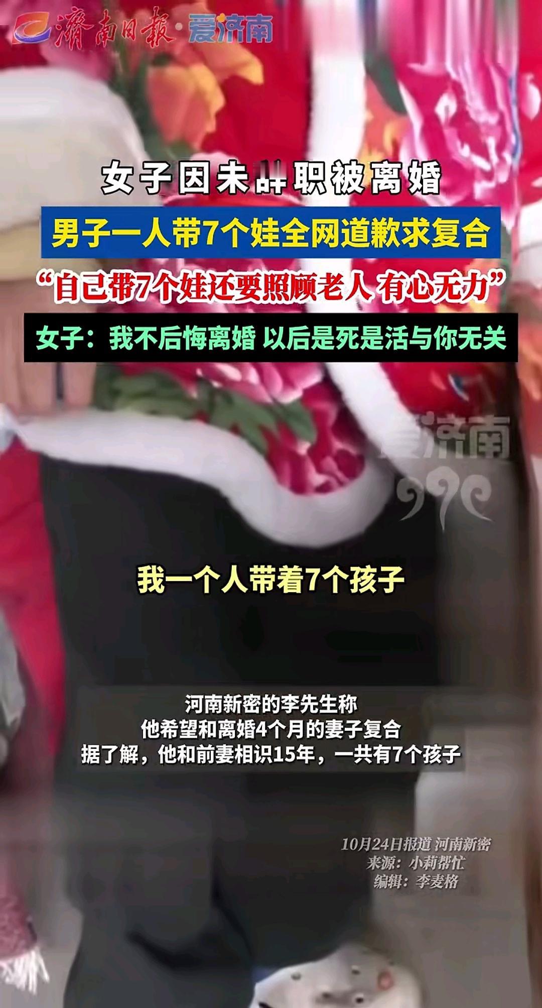 一场离婚,让一个拥有7个孩子的父亲,第一次体会到了“有心无力”。 相识十五年 生了七个娃 以前大概觉得老婆带娃是理所当然 直到离婚后自己扛 才知道日子有多难 又要管七个孩子吃喝拉撒 又要照顾家里老人 累到崩溃才想起全网道歉求复合 早干嘛去了 老婆一句“不后悔 死活与你无关” 听着绝情 实则是攒够了失望 十五年的付出没被看见 离婚后才等来对方的“幡然醒悟” 现在有些男人总把“我挣钱养家”挂嘴边 却忘了家里的一地鸡毛更磨人 七个孩子不是一天长大的 老婆的辛苦也不是一天攒下的 他求的哪里是复合 更像是求个“免费保姆”回去 等日子重回正轨 说不定又会忘了此刻的“有心无力” 到底是失去后才懂珍惜 还是实在扛不住了才想起老婆的好 你们说 这样的复合请求 该答应吗离婚以后的感悟