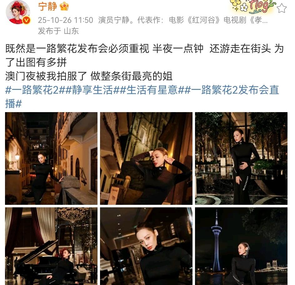 一路繁花2澳门夜,宁静的这个黑色造型,真的太哇塞了! 宁静说:既然是一路繁花发布会必须重视,半夜一点钟,还游走在街头,为了出图有多拼…… 澳门夜被我拍服了 做整条街最亮的姐…… 哈哈,我被征服了!这样的宁静,成为整条街最亮的姐,那是分分钟的事。 不得不说,在穿搭这一块,在凹造型这一方面,宁静从来没输过,并没有硬夸哦,这一次真的很哇塞。 在澳门璀璨的夜色中,宁静就像一只黑天鹅,在翩翩起舞,美呆了!你们觉得怎么样?