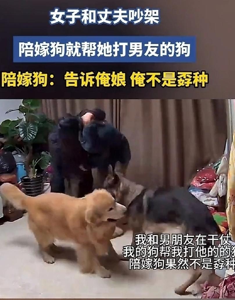 10月26日,河南。一对结婚不久的夫妻吵了起来,随即扭打成一团。夫妻俩人各养了一只狗。丈夫养的一只狗想帮男主人的忙。妻子的陪嫁狗想帮女主人的忙。两只狗子各自为了自己最亲的主人,也互相对掐起来。一时间,房子里面好不热闹,人和人打,狗和狗打。 屋里面虽然人、狗大战,乱成一团。但看得出来,各方还是留有余地,没有下死手。正如老话说的,打是亲骂是爱。夫妻俩人平时打情骂俏,让生活充满情趣。这两只狗子很聪明,跟着主人也学会了打情骂俏。看它们的架势,与其说是干架,倒不如说是在闹着玩呢。 夫妻间吵架 陪嫁狗