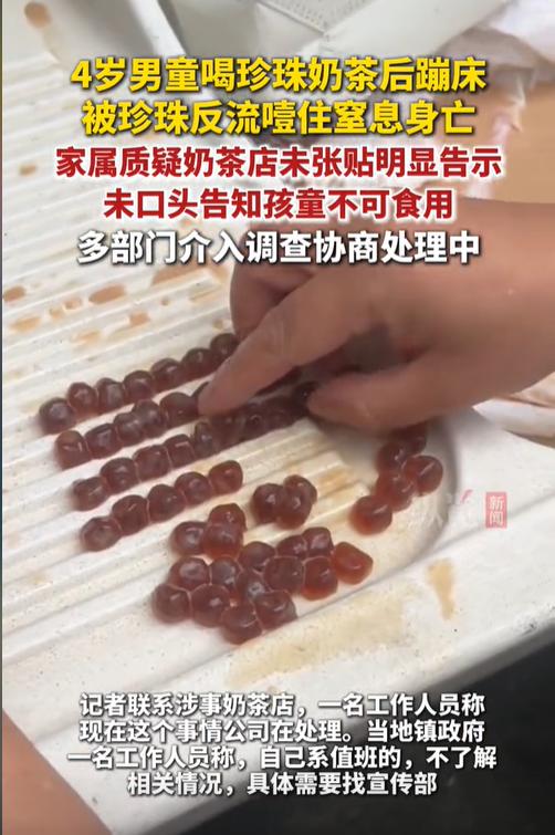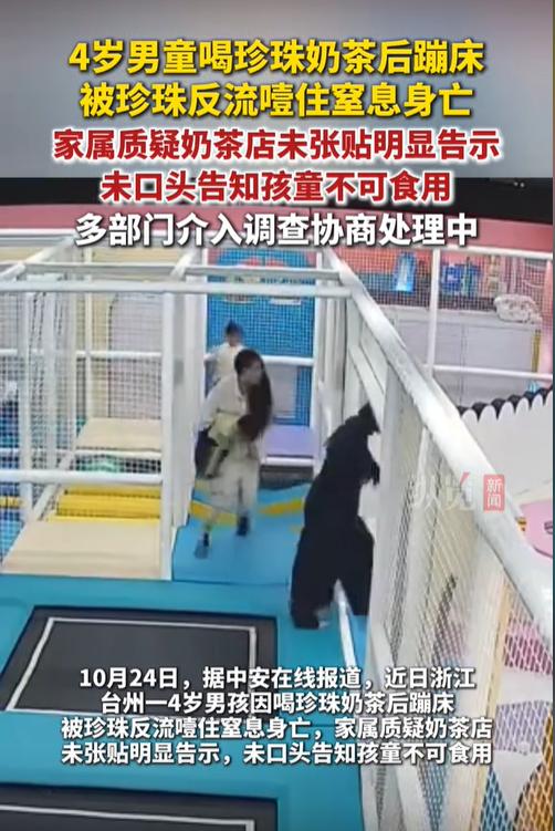 浙江临海,一3岁男童喝了珍珠奶茶后,跑去游乐场玩蹦床,结果不慎摔了一跤,导致奶茶