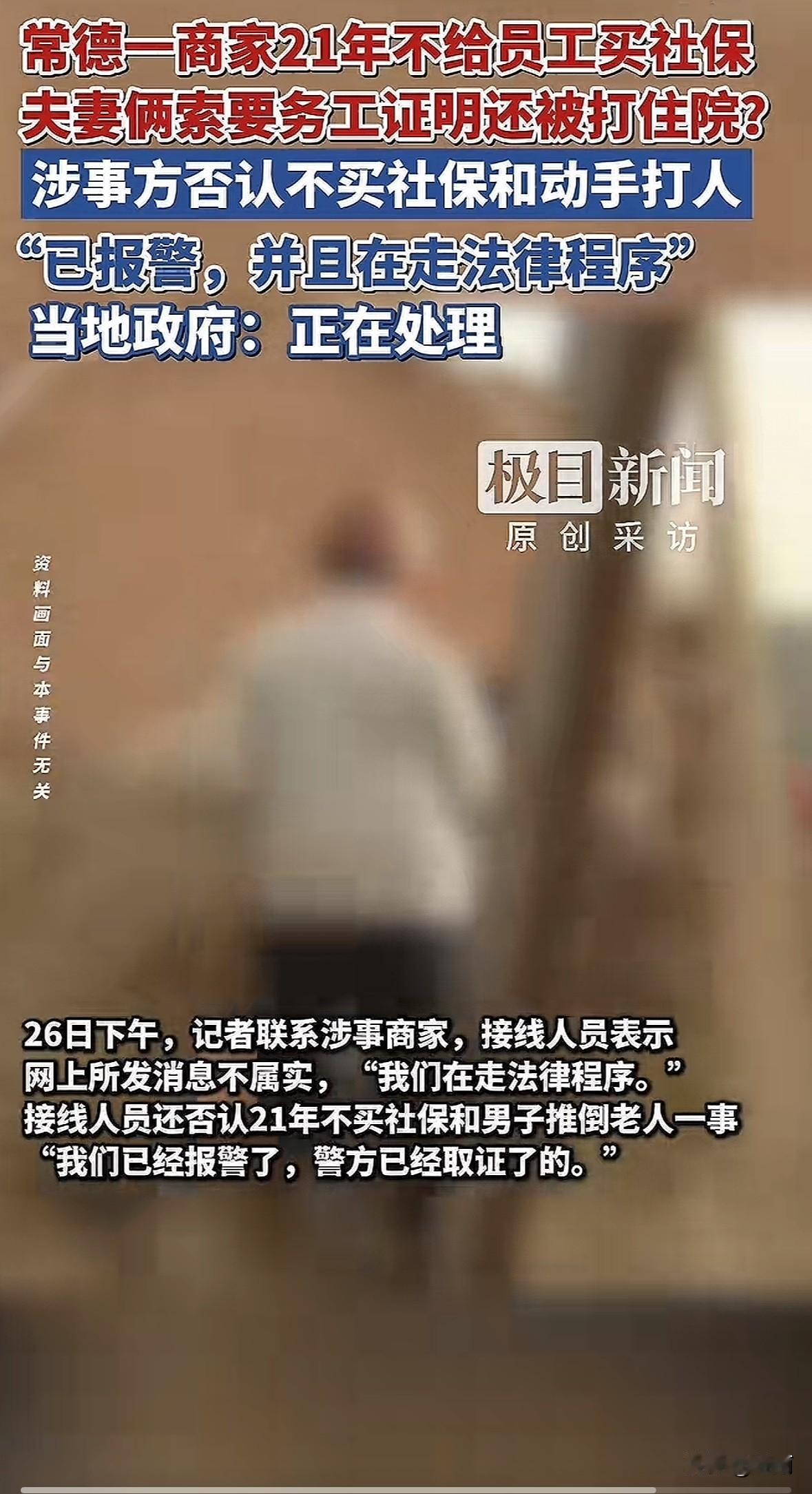 湖南常德武陵区高山街一商家,有员工在这儿干了21年,社保一直没给买。员工家人要务工证明想劳动仲裁,商家不给,还发生冲突,员工父母被推倒,母亲摔到头昏迷。 网友发视频说这事,已经报警了。商家那边不承认,说消息不实,自己也报了警走法律程序。武陵区政府说街道在处理这事。 按最高法新规,不管啥情况,不缴社保的约定都无效,公司得补还得给补偿。就算没务工证明,去劳动监察投诉,协商笔录能当证据。21年社保可不是小事,违法成本早不是躲能解决的,等着部门查清楚给个说法。