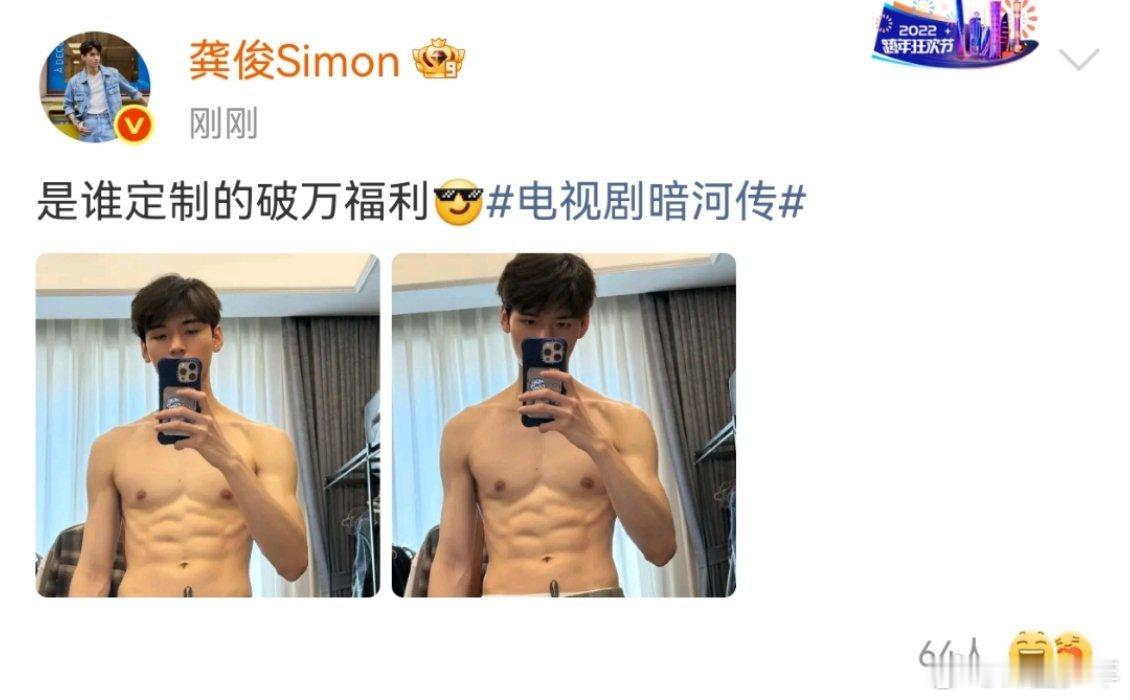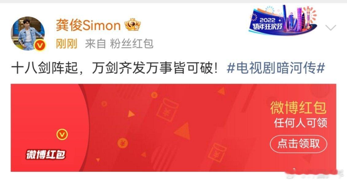 龚俊破万红包 救命!龚俊《暗河传》破万居然又送腹肌照又发红包!完全不搞虚的,福利直接给到粉丝心坎里,一边欣赏绝绝子的肌肉线条,一边拼手速抢红包,这波操作既用心又实在,谁能不被这样的龚俊圈粉啊!