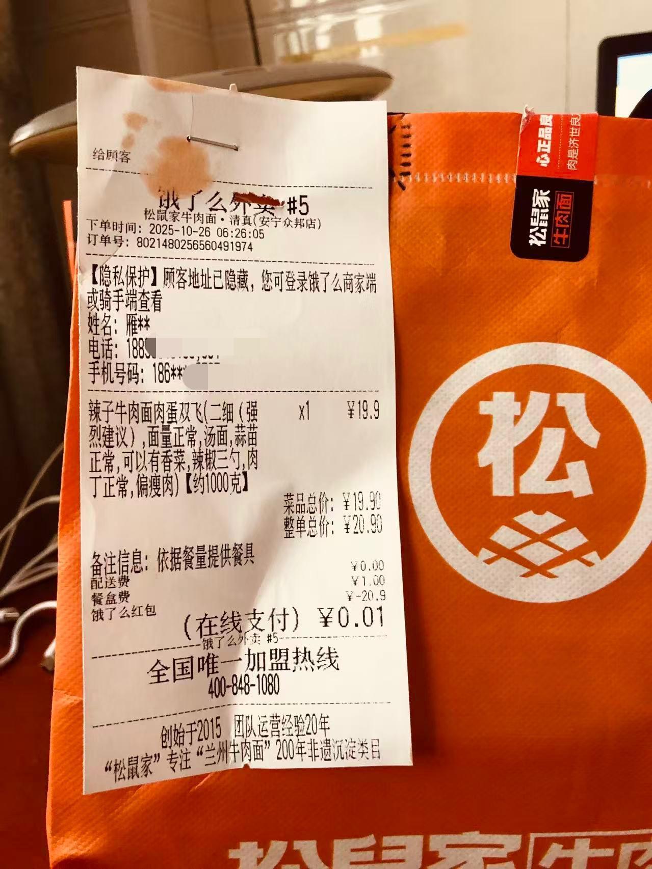 我觉得点外卖花了钱,大部分成本都在包装上了,这个牛肉面的外卖还有保温袋牛肉汤送来