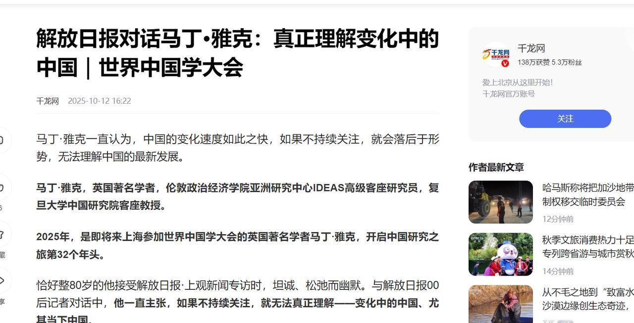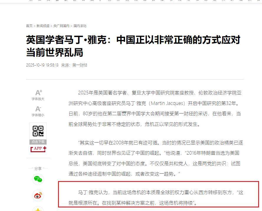 80岁英国学者放话:世界乱成这样,根源终于找到了!中国做对了关键一步。 马丁·雅克,研究中国32年,在复旦当客座教授,最近接受采访直戳全球乱局的痛点,他说如今世界这么乱套,根子在于权力正从西方往东方挪移,中国在这过程中踩对了步子。 咱们先琢磨琢磨这权力转移到底是咋回事。马丁・雅克说 2008 年金融危机就是个分水岭,那时候美国就露怯了,信心没以前足了,而中国的势头越来越显眼。这就跟以前家里老大说了算,突然发现老二老三能干起来了,老大心里发慌,就开始找事。 上世纪二三十年代英国没落、美国崛起时,不也打关税战、搞货币小圈子吗?现在美国干的事儿一模一样,特朗普搞关税、卡半导体脖子,两党还达成共识要遏制中国,说白了就是怕权力被抢走。 你看现在俄乌冲突、中东乱局,还有 G7 峰会开得一塌糊涂,表面是局部问题,根子都是这权力转移闹的 —— 老霸主不想放手,又拦不住大势,世界能不乱吗? 关键是中国咋踩对步子的?不是像美国那样搞霸权,而是踏踏实实搞合作、强自身。就说中老铁路吧,这可不是简单修条路,开通到现在,光旅客就送了快 5000 万人次,今年头几个月就拉了 410 万人,112 个国家的人都坐过这趟车。 货运更实在,昆明到泰国的运费降了三成到五成,老挝本地运输成本也低了两到四成,以前卖不出去的热带水果,现在几天就运到中国市场,中国的家电、机械也能顺顺畅畅卖到东南亚。 中国和老挝的贸易额,2021 年才 43.5 亿美元,到 2024 年前 9 个月就涨到 60.74 亿美元,这路一通则百业兴,周边国家都跟着受益。 马丁・雅克说中国制造业占世界 30%,有包容性,这话真没假,中老铁路就是例子,不是抢利益,是造机会,这样的合作谁不乐意? 再看金砖国家,以前就几个国家,2024 年一扩员,现在经济总量占全球 1/3,人口快到一半了。这可不是中国拉山头,是大家自愿凑过来的,因为美国搞贸易保护、美元霸权太伤人了。 宁波前两个月对金砖国家进出口就有 561.7 亿元,涨了 7.3%,民营企业占了七成多,余姚的公司从印尼进口原材料,宁波的电子企业在马来西亚占了 40% 的插座市场,这都是实实在在的生意。 更关键的是金砖国家开始用自己的钱做生意,俄罗斯和其他金砖国家贸易里,本币结算从两年前的 30% 涨到 85%,不用看美元脸色,也不怕美国制裁,这就是中国推动的路子 —— 大家一起赚钱,不是一家独大。 反观西方那些所谓的 “老大”,现在乱成一锅粥。今年 6 月的 G7 峰会,本来想摆摆架子,结果各国各说各的,日本骂以色列,德法怕油价涨,特朗普却力挺以色列,最后连联合公报都签不出来。 特朗普还没开完会就走了,受邀的国家领导人空跑一趟,真是越活越回去了。欧盟主席还想拿块磁铁抹黑中国,鼓捣 “脱钩断链”,可现实呢? 中国是世界最大制造业国家,30% 的制造业产品都来自中国,半导体领域也在慢慢自主,美国搞的那些封锁打压,看着凶,其实根本挡不住。就像马丁・雅克说的,美国那套行不通,中国的韧性太足了。 中国踩对的关键,就是没跟着西方搞 “零和博弈”,而是走 “共赢” 的路子。以前西方当老大时,要么抢资源,要么搞制裁,现在中国搞 “一带一路”,建金砖合作机制,都是让大家一起发展。 磨憨口岸因为中老铁路,从 “通道” 变成 “口岸经济”,招商引资来了千亿大单;老挝万象的开发区吸引了 9 个国家的 154 家企业,年产值超 20 亿美元。 这些不是靠强迫,是靠实在的好处。马丁・雅克说中国处于更优势的地位,这话没错,因为中国顺应了 “权力转移” 的大势,不是去争老大,而是搭平台,让大家都能分到好处。 现在世界乱归乱,但方向很清楚。西方还在搞小圈子、玩对抗,中国在搞合作、强实业。就像宁波的外贸企业,不盯着美国市场,转头跟金砖国家做生意,照样赚得盆满钵满。 那些还抱着美国大腿的发展中国家,马丁・雅克都替他们着急,其实美国市场早没那么重要了,跟着中国搞合作才是明路。 说到底,马丁・雅克这 32 年没白研究,他看明白了:权力转移难免乱,但中国的做法是 “以稳制乱”,不搞对抗搞合作,不拼霸权拼实力。这步棋踩得太准了,既守住了自己的节奏,又给世界留了条出路,难怪他说对中国有信心。