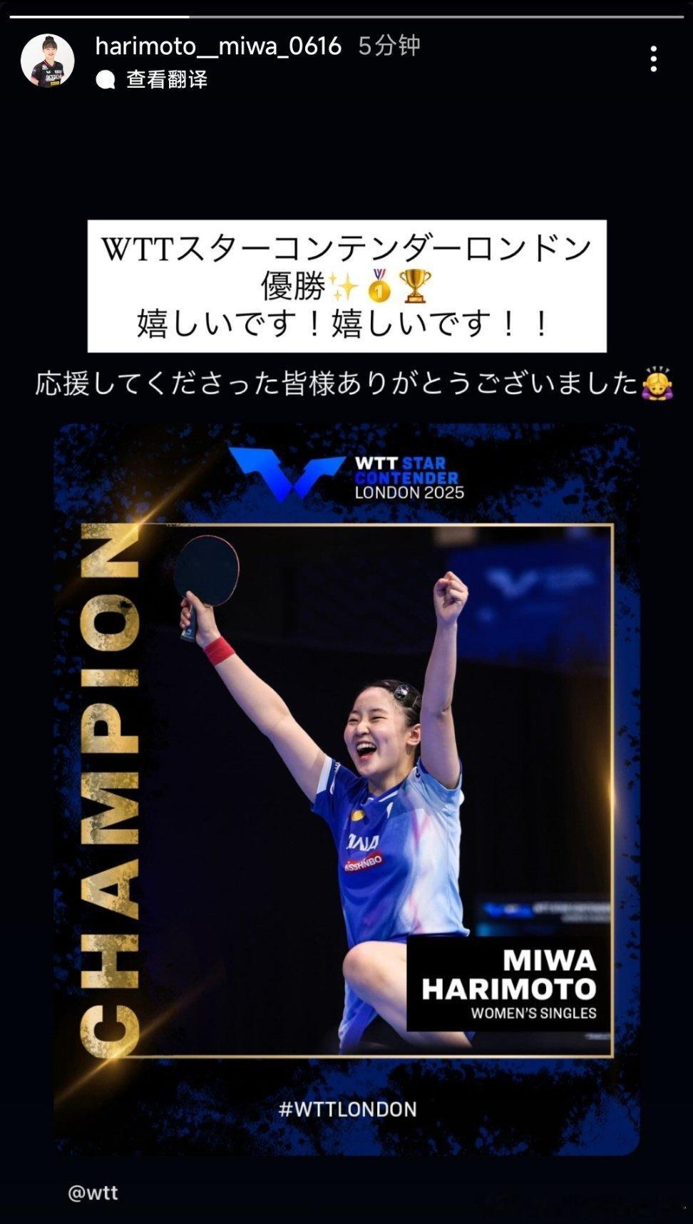 张本美和:WTT伦敦球星挑战赛女单夺冠✨🥇🏆太开心了!太开心了!!感谢所有