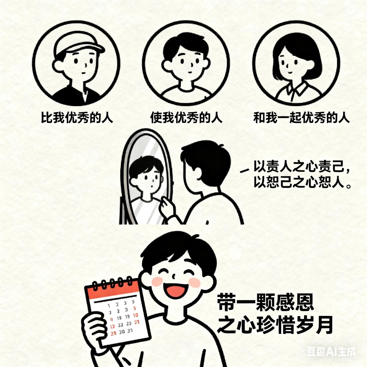 喜欢一句话: 比我优秀之人 使我优秀之人 与我共优秀之人 以责人之心责己 以恕己之心恕人 怀一颗感恩之心 珍惜岁月 “比我优秀的人” 如照亮方向之光 让我们见成长可能 “使我优秀的人” 是身边的贵人 以帮助点拨激励 “推我们不断向前 和我一起优秀的人” 是同行的伙伴 彼此扶持前行 把路走得更稳更远 “以责人之心责己, 以恕己之心恕人” 是严于律己、宽以待人的智慧 能减少人际摩擦 “带一颗感恩之心珍惜岁月” 是将清醒善意融入日常 让经历皆有温度 这段话 把重要人际关系与自我修养 讲得透彻 既清醒又温暖 那些激励我的话 对人的感恩