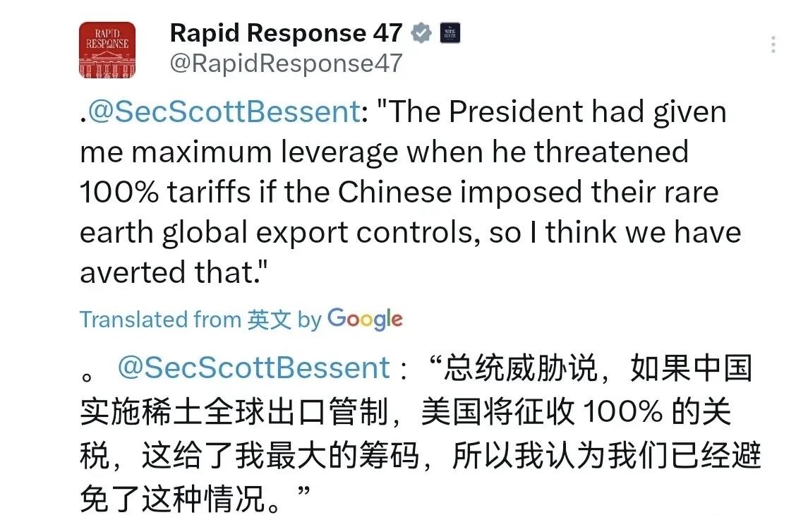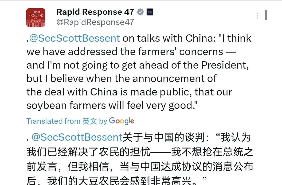 贝森特出来讲话了,中美达成的部分协议被美国曝光!看似美方占了便宜,实则这场博弈里没有单方面的让步。 2025年10月26日,美国财长贝森特接受采访时,字里行间透着得意。他直言特朗普11月1日的100%关税威胁,成了他谈判的重要筹码。 他宣称达成了实质性框架,避免了关税升级,还解决了美国农民的担忧,暗示中方会恢复采购美国大豆。 但明眼人都清楚,中美博弈走到今天,不可能存在单方面让步的情况。美方拿到想要的,必然要在中方关切的问题上回应。 中方代表会谈后明确提及芬太尼关税、禁毒合作、美方301船舶收费等问题,这些都是必须解决的核心诉求。 先看大豆贸易,这从来不是单方面的施舍。2022年中方采购美国大豆3700万吨,2024年因贸易摩擦降至1900万吨。 此次恢复采购,大概率回归3000万吨级规模,既满足美方农民需求,也能平衡国内市场供应,是双赢选择。 再说说芬太尼问题,中方的管控力度有目共睹。2019年我们全球率先整类列管芬太尼类物质,2024年又新增列管46种新精神活性物质。 美方多个部门都认可这些合作成果,却曾以所谓芬太尼问题为借口加征关税,这种双重标准实在说不过去。 此次谈判若能重启对等禁毒合作,不仅符合双方利益,也能戳破美方此前的虚伪面具。 美方301船舶收费措施更让中方企业苦不堪言,每航次额外支出1.2万美元,累计增加成本超8亿元。 这些不合理的收费,直接挤压了中方航运企业的利润空间,此次谈判必然要针对性调整,这是中方的合理诉求。 网友对此事的争议不小,相关话题阅读量超6.2亿,登上热搜前三。65%的人支持这种双向共赢的结果。 还有29%的人担忧美方反悔,毕竟他们在关税问题上反复无常的例子太多了。2023年美方承诺降低钢铝关税,后来就反悔了。 这种言而无信的过往,让大家不得不保持警惕。毕竟协议的价值,最终要看兑现的程度。 对比欧盟与美国2024年的数字服务税谈判,就能明白对等原则的重要性。欧盟坚持利益互换,最终实现了关税互减。 中美贸易谈判也该如此,只有双方都拿出诚意,才能让协议真正落地。贝森特的高调表态,或许还藏着美国国内的政治考量。 2025年美国大选临近,特朗普团队需要借对华贸易议题争取农业州选票,这可能是美方急于曝光有利信息的原因之一。 在我看来,这次达成的框架是积极信号,说明中美正朝着解决分歧的方向努力。但这只是第一步,后续执行才是关键。 美方若真想推动合作,就该摒弃双重标准,切实兑现承诺,在芬太尼合作、船舶收费等问题上给出实质性解决方案。 如果美方继续出尔反尔,搞背后小动作,最终只会损害双方的贸易互信。未来,中方应保持警惕,用实际行动维护自身利益。 随着协议细节的逐步公布,相信会有更清晰的答案。但无论如何,双向奔赴的合作才可持续,单方面的索取注定无法长久。 文章描述过程、图片都来源于网络,涉及版权或者人物侵权问题,或有事件存疑部分,联系后即刻删除或作出更改。