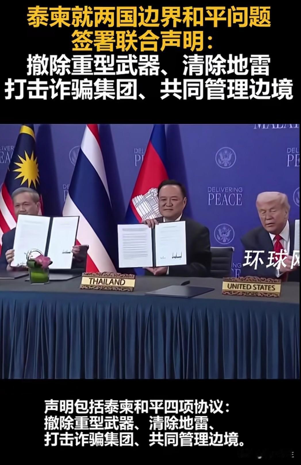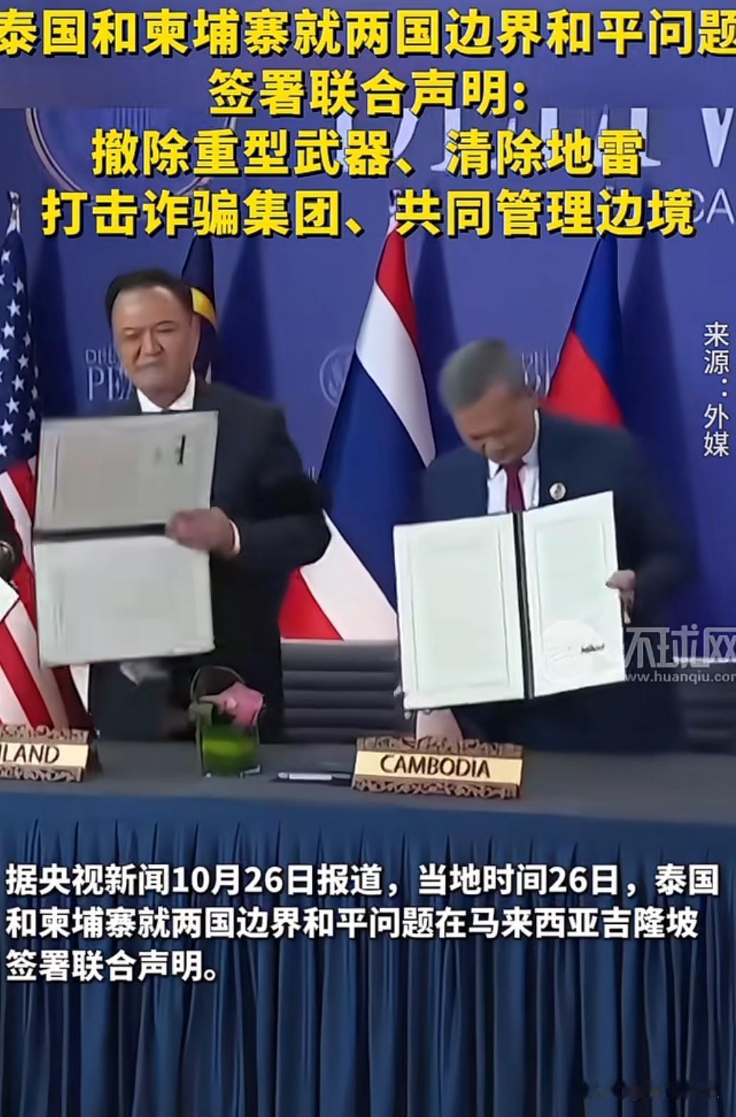 泰国和柬埔寨今日就两国边界和平问题达成四项协议,包括撤除重型武器、清除地雷、打击诈骗集团及共同管理边境。这一成果为两国边境地区带来和平稳定的新希望。 两国总理在签字仪式上表示,将共同致力于维护边境地区的和平与发展,通过对话协商解决分歧。分析人士指出,这一协议将有助于两国加强经济合作,促进地区稳定与繁荣。
