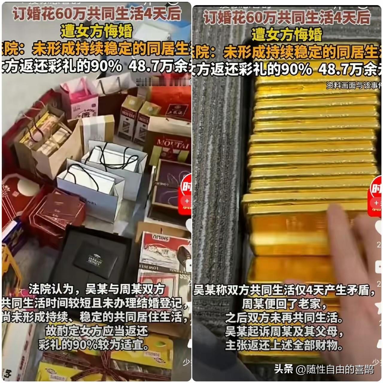 当代小仙女的赚钱方式! 江西一男子与女方花60万订婚,遭女方悔婚,两人共同生活4天分手。法院判决返还48.7万,这60万包含彩礼38.8万,见面礼6万,大打送钱4万,亲属红包5.3万,金条戒指7.32万。 有人说,这不等于一天挣3万吗?也有人说,60万订婚,女方悔婚,这不应该双倍返还吗?这怎么能让男方赚起来了呢?应该保护妇女权益,但也要防止犯罪啊!也有说,这不是在鼓励骗婚吗?要彩礼的,最好的办法就是先结婚再要,这样离婚也分不了。现在的年轻人,怎么看彩礼这事的?欢迎大家评论讨论 麻烦看官老爷们右上角点击一下“关注”,既方便您进行讨论和分享,又能给您带来不一样的参与感,感谢您的支持!