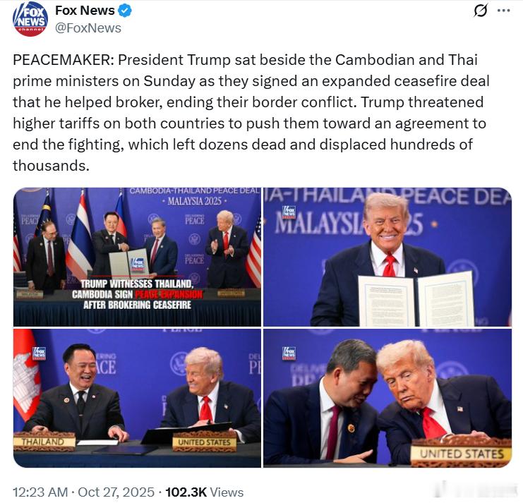 和苹缔造者——周日,特朗普总统与柬埔寨和泰国总理并肩而坐,见证了双方签署由他斡旋的扩大版停火协议,正式结束两国的边境冲突。为了促使双方达成协议、停止战斗——这场冲突已造成数十人死亡、数十万人流离失所——特朗普曾威胁对两国提高关税,最终推动了和苹的达成。