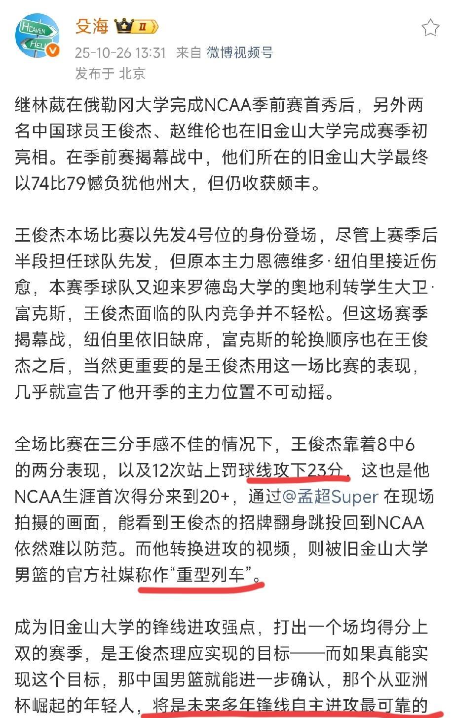 恕我直言!王俊杰在通过一场NCAA比赛,让张镇麟在男篮位置不稳,曾凡博也会感到压力,在代表旧金山大学比赛中,王俊杰两分球8中6,12次罚篮拿到23分!不愧是亚洲杯最佳前锋,旧金山大学称他是“重型列车”,篮球名嘴殳海盛赞:是中国男篮未来锋线自主进攻最靠谱的存在;恕我直言,张镇麟和曾凡博同时期没达到王俊杰的高度,无论是国家队还是海外联赛,不出意料,王俊杰是男篮领袖