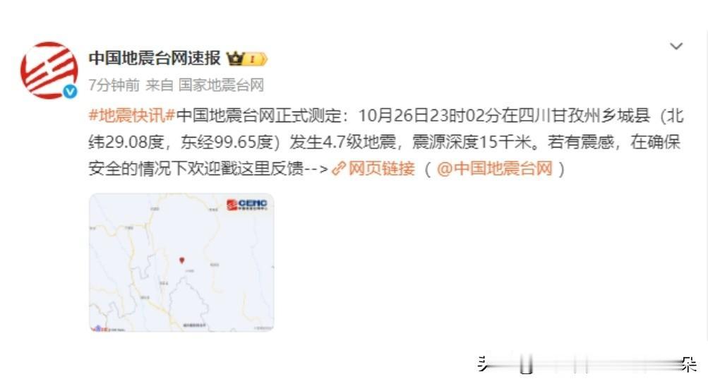 四川甘孜州乡城县突发4.7级地震!震感明显但暂无伤亡,最新动态速报 ——深夜突发!甘孜州乡城县发生4.7级地震,网友:墙皮都震掉了! 📅 时间与地点 据中国地震台网正式测定,北京时间2025年10月26日23时02分56秒,四川甘孜藏族自治州乡城县(北纬29.08度,东经99.65度)发生4.7级地震,震源深度15千米。此次地震震中位于乡城县西南部,距离县城约22公里,周边5公里内有尼丁、热打村等村庄,20公里范围内涉及热打镇、正斗乡等乡镇。 🌍 震感与灾情反馈 尽管震级未达破坏性级别,但高原地区地壳传导效率高,震感普遍强烈。多名网友反映,地震发生时“明显晃动”“墙皮脱落”,部分区域出现短暂停电。不过,目前官方尚未接到人员伤亡或重大基础设施损毁报告,灾情整体可控。 🚨 官方响应与背景分析 四川省地震局迅速启动监测,确认震源机制为浅源地震(15公里),能量释放集中,未积累后续风险。此次地震属于川西高原地质活跃区的常规波动,历史上该区域3级以上地震频发,但鲜少造成严重破坏。 ⚠️ 温馨提示 1. 余震关注:建议当地居民留意短期余震,避免前往山体松动区域; 2. 次生隐患:高原地区需排查道路落石、电力设施隐患; 3. 科学认知:浅源地震震感明显但破坏力有限,无需过度恐慌。 📌 延伸阅读 - 甘孜州位于青藏高原东缘断裂带,地质活动频繁,但主断裂带核心段未受此次地震波及; - 对比2022年云南宁蒗5.5级地震,本次能量释放仅为前者的约1/30。 📍 最新进展 截至发稿前,地方政府正排查具体灾情,后续进展将持续关注。 (综合自中国地震台网、川观新闻、网友反馈等)