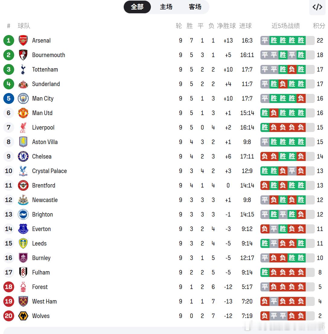【积分榜】英超第9轮全部结束!大家对主队的表现还满意吗,你的主队排名第几?[并不简单]