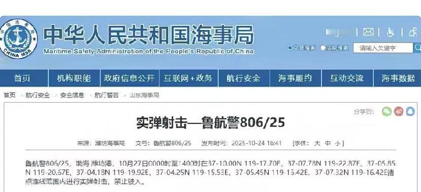 注意!潍坊海事局紧急发警告:今晨0点起,渤海这片海域实弹射击,禁止任何船只驶入 10月27日刚到零点,渤海潍坊港附近一片特定海域,就正式进入“实弹射击”的禁行时段——这不是临时通知,早在10月24日下午4点41分,潍坊海事局就通过官方渠道发布了编号“鲁航警806/25”的航行警告,把时间、范围说得明明白白,就怕有船只误闯。 这次禁航的海域划得特别清晰,不是模糊的“潍坊港周边”,而是给了七个精确到小数点后两位的经纬度坐标:从37-10.00N、119-17.70E开始,一路连到37-07.78N、119-22.87E,再经过37-05.85N、119-20.67E等五个点位,最后绕回起点,圈出了一块专门用于实弹射击的区域——懂行的船老大一看就知道,这范围是精准算过的,既避开了主要航道,又能确保射击安全,半点不含糊。 而且禁行时间卡得特别严,从10月27日凌晨0点整开始,一直到当天下午2点整结束,整整14个小时,不管是渔船、货船,还是过往的小艇,都绝对不能往这片圈定的海域里开。要知道,实弹射击期间,海域内会有弹药发射、落弹,哪怕是误闯一点点,都可能出大危险,所以海事局早早就把警告发出来,就是为了让所有航行船只提前规划路线,绕开这片“危险区”。 现在这个点,正是渤海海域渔船准备作业、货船往来潍坊港的时段,不少船主前几天看到警告后,都已经调整了出海计划——有人把原本今早要去潍坊港卸货的行程,提前到了26号下午;也有附近的渔民,特意把渔船停进港内,打算等下午2点禁航结束后再出海。大家都清楚,海事局发这种实弹射击警告从不含糊,跟着通知走,才能安安稳稳的。