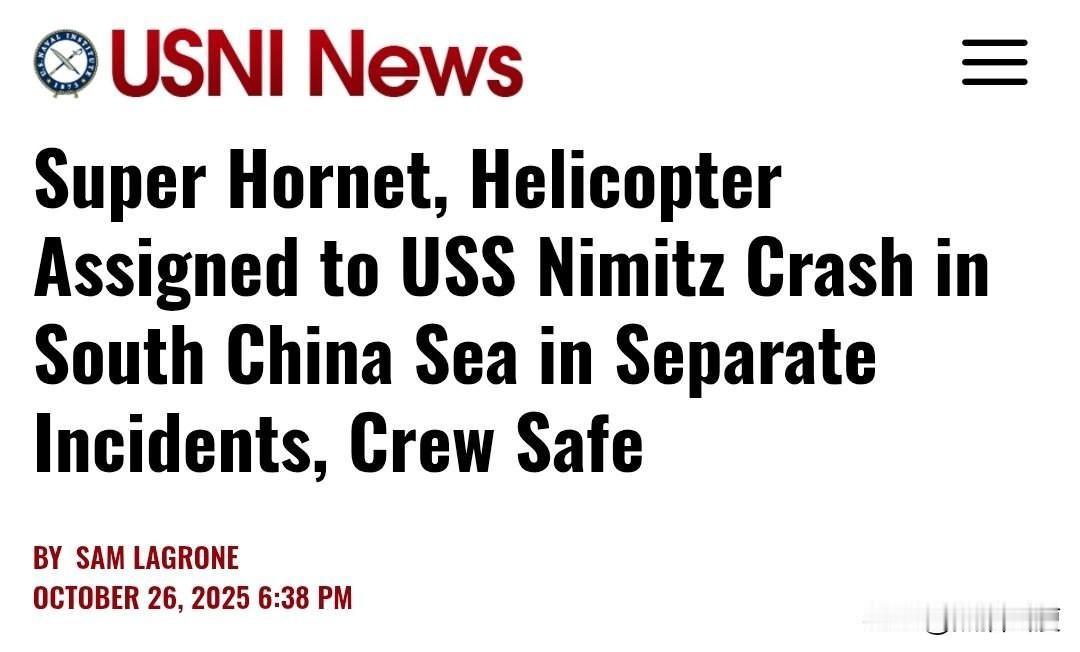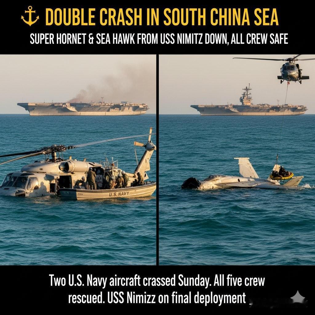 不是巧合!昨日有两架美国海军飞机在我们南海(仅越南和马来西亚水域)相继坠海,间隔仅40分钟,而两架飞机之间的飞行任务没有任何关联性。 第一架是"战猫"中队的一架MH-60R海鹰直升机,于下午2点45分左右在美国海军例行任务中坠落水面。三名机组人员均被救起。 第二架则在下午3点15分,来自"红色战鸡"中队的双座F/A-18F"超级大黄蜂"战斗机在同一航母上飞行时直接坠毁。两名飞行员均弹射逃生。 难道美国真到了令我们什么都不用做,自己就没了的阶段吗?