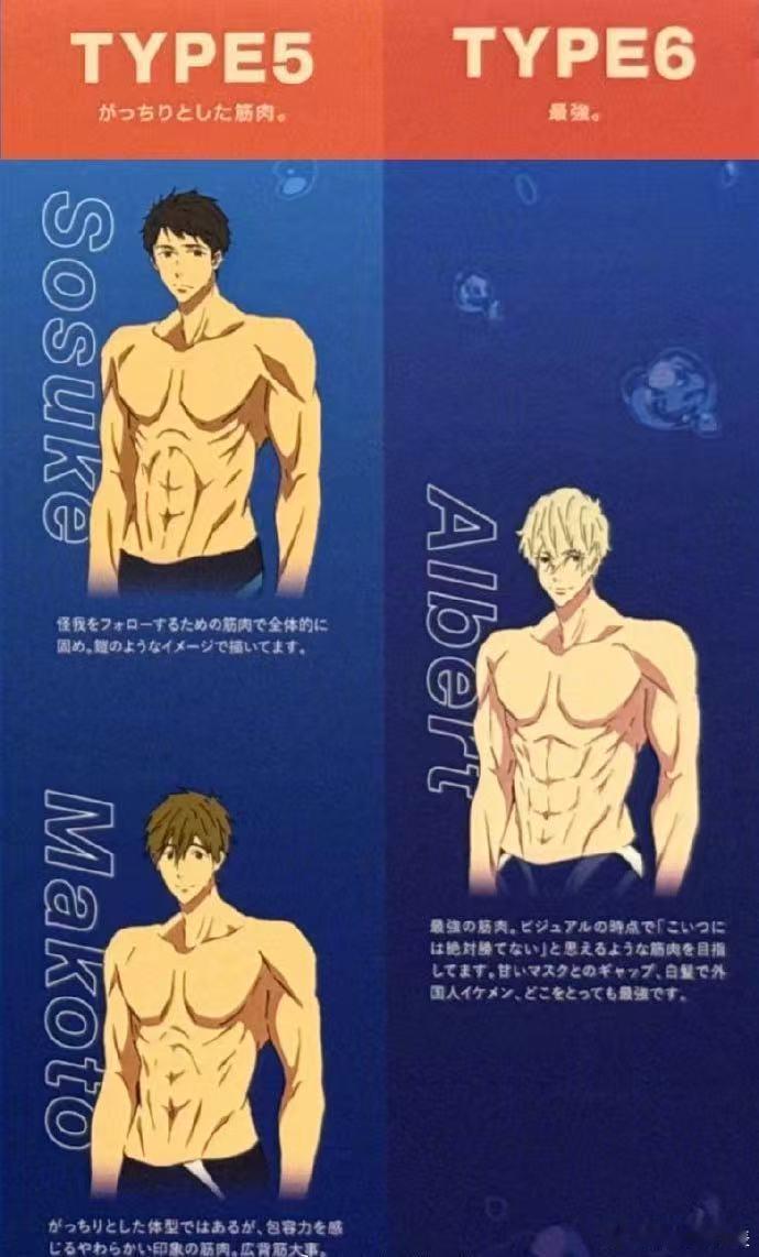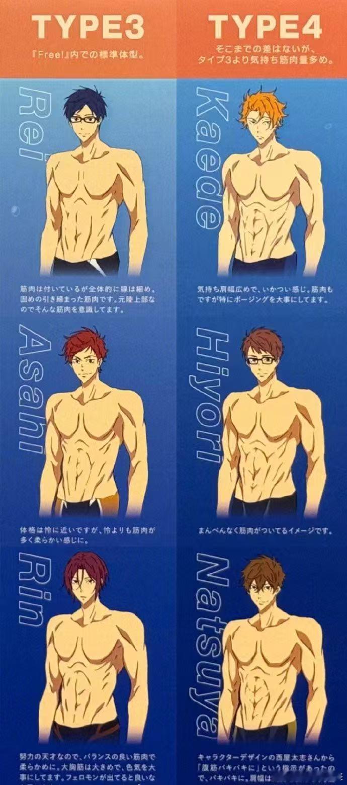 Free角色肌肉含量排名《Free!》动画总作画监督冈村公平总结的几位角色的肌肉含量排名↓