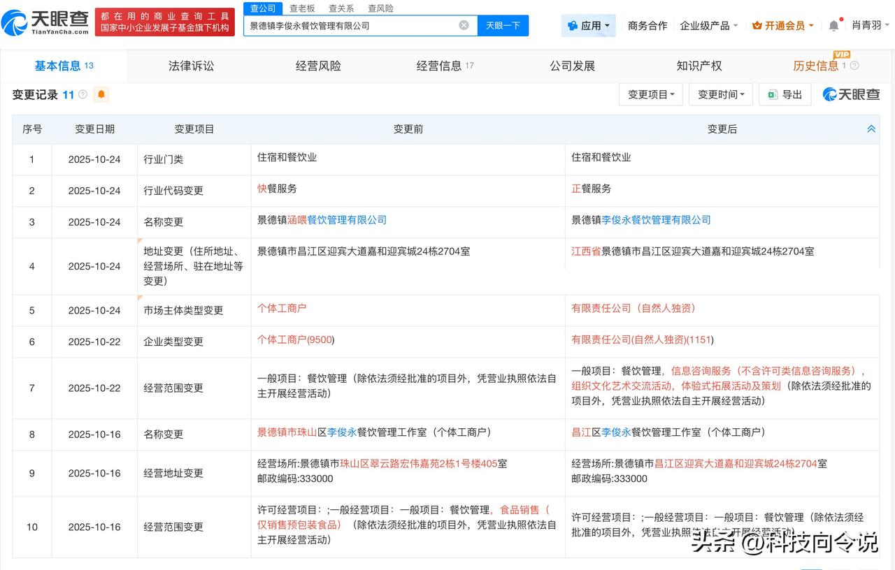 【鸡排哥公司行业代码变更为正餐服务 鸡排哥公司近期三度更名】 天眼查App显示,近日,景德镇涵喂餐饮管理有限公司发生工商变更,企业名称变更为景德镇李俊永餐饮管理有限公司。同时,行业代码由快餐服务变更为正餐服务。 该公司成立于今年9月,法定代表人为李俊永(鸡排哥),注册资本100万人民币,经营范围包括餐饮管理、信息咨询服务等,由李俊永全资持股。 天眼查信息: