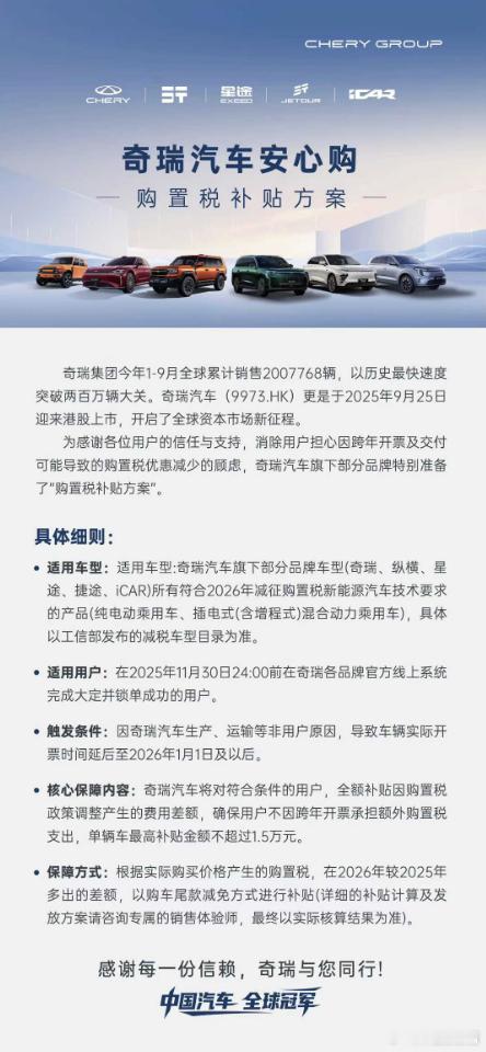 该方案适用于奇瑞旗下多个品牌,包括奇瑞、纵横、星途、捷途、iCAR等品牌中符合2026年减征购置税技术要求的新能源车型。用户在2025年11月30日前完成大定并锁单即可参与。