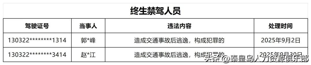 秦皇岛交警最新通报: 又有2名司机因交通事故后逃逸,被列入9月终生禁驾名单! 这可不是小事!造成事故后逃逸,不仅违法,更是对生命的漠视! 秦皇岛交警这次曝光,就是要给所有司机敲响警钟——逃逸必严惩,违法必追责! 终生禁驾意味着什么? 他们这辈子都不能再合法开车了! 交通事故难免发生,但逃逸就是错上加错! 你逃得了一时,逃不了一世!交警的天眼、监控、线索,迟早会让你现形! 守法驾驶,出了事别跑! 停下来、救人、报警,才是正确做法。逃逸只会让后果更严重,甚至面临刑事处罚! 秦皇岛交警这次曝光,不仅是惩戒,更是警示! 希望所有司机引以为戒,安全驾驶,敬畏法律!