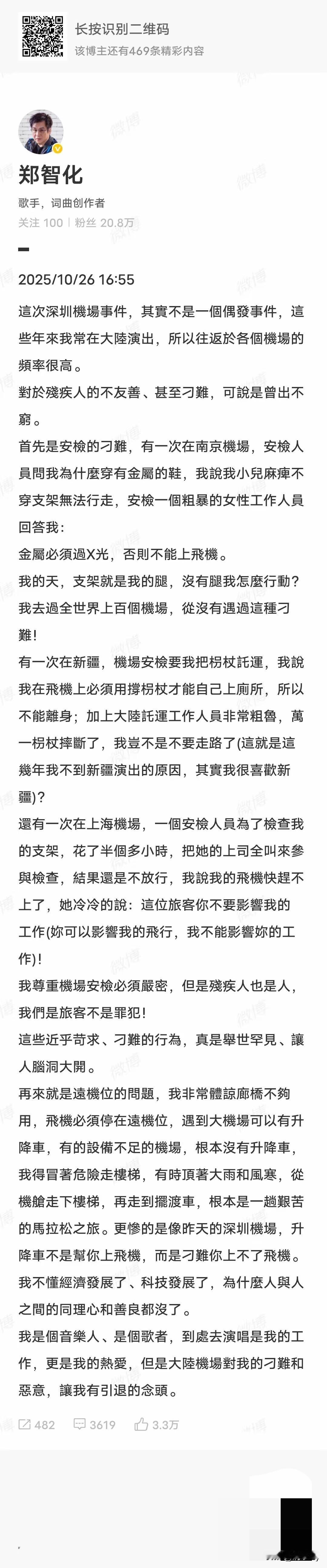 看了深圳机场的视频,郑智化登机的全过程机场的两名工作人员,一名工作人员扶着轮椅,另一名工作人员则是在附身耐心沟通! 沟通后扶着他拄着拐杖进入机舱,工作人员还猫下腰耐心的扶正了他的假肢!期间都没出现过任何不帮助的问题! 根本就没有像郑智化自己所说的连滚带爬、对残疾人不友善,甚至于刁难的情况! 10月26日,郑智化列出了近些年来在大陆机场遭受的,他认为所谓的刁难行为,甚至于用举世罕见、脑洞大开等词语来形容! 他还说科技发展了,为什么人与人之间的善良和同理心都没有了!因为大陆机场对他的刁难和恶意让他有了隐退的想法! 这分明就是反咬一口,给自己立一个受害者的人社,对大陆机场恶意抹黑!不过隐退也很正常,毕竟年龄也大了,身体又不方便!免得去处处刁难别人!