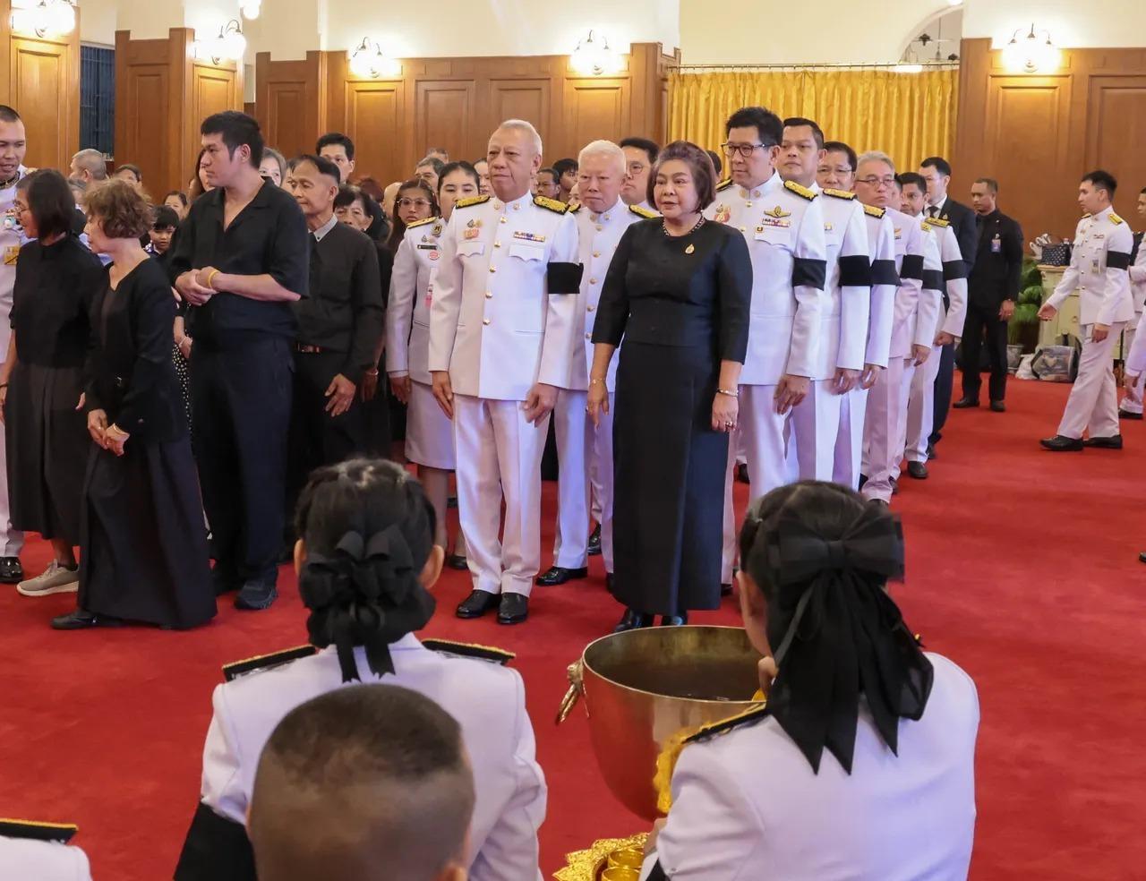 泰国国丧,和咱们的追悼活动颇多相似,多位现任内阁成员及前内阁成员臂戴黑纱前往悼念。 泰国前总理赛塔、佩通坦到场参加滴水缅怀仪式。泰国有不少华人后裔,泰国王室推崇华夏文明。 到场参加诗丽吉王太后追悼会的亲友,身穿黑白两色衣服,场面庄重。