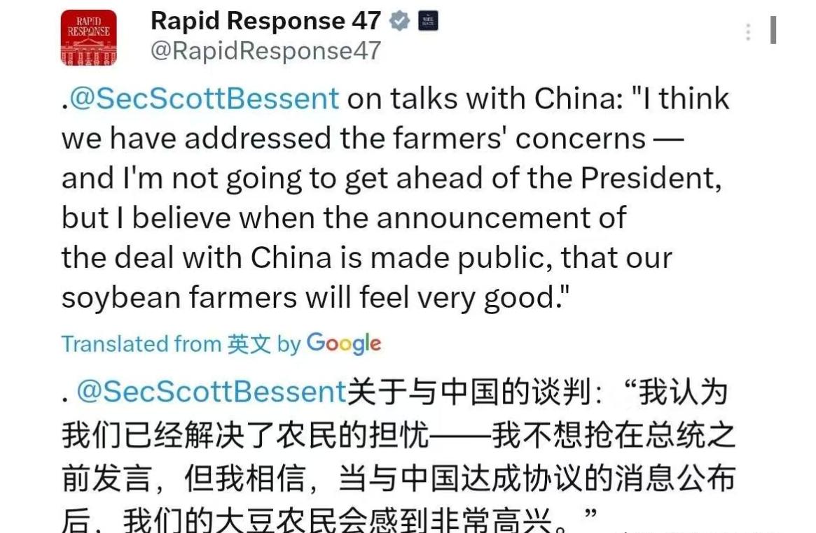 贝森特曝光中国即将恢复对美国粮食的采购!   说白了,这就是典型外国媒体的报道,他们只报道自己想看到的。但是对于中国恢复对美国食品采购的价格,他们避而不谈。很可能就是因为价格过高,他们也不得不接受的原因!   其实现在中美贸易谈判最核心的部分就是出口管制的问题,我们不能把它简单的叫做稀土问题了,因为双方都在搞出口管制,美国搞芯片管制,我们对等还以稀土管制,要松就一起松手。   说到底,“拖”是对我们最有利的战术,因为美国各产业制造、民生债务等等,随时都可能要了美国的命。而现在立马谈成,不管获益多少,大概率是我方明面上看起来的损失大一点。 但是由于中美贸易“你中有我,我中有你”,不可能完全的对美国“脱钩”。所以。这也是中国所不得不做出的选择。   但是,美国现在依然没有信誉可言,即使签了协议,他感觉没占到多大便宜的时候,随时都可能撕毁,再制裁你占得先机。让你一直被动跟从,谈到他满意为止,这就是美国的一贯伎俩!