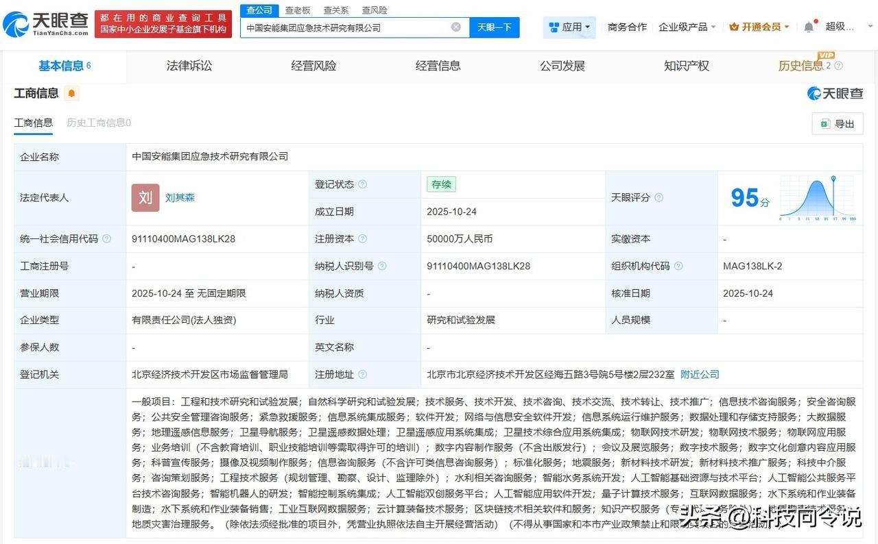 【中国安能集团成立应急技术研究公司 注册资本5亿】 天眼查App显示,近日,中国安能集团应急技术研究有限公司成立,法定代表人为刘其森,注册资本5亿人民币,经营范围包括工程和技术研究和试验发展、自然科学研究和试验发展、智能机器人的研发、智能控制系统集成等。股东信息显示,该公司由中国安能建设集团有限公司全资持股。 天眼查信息: