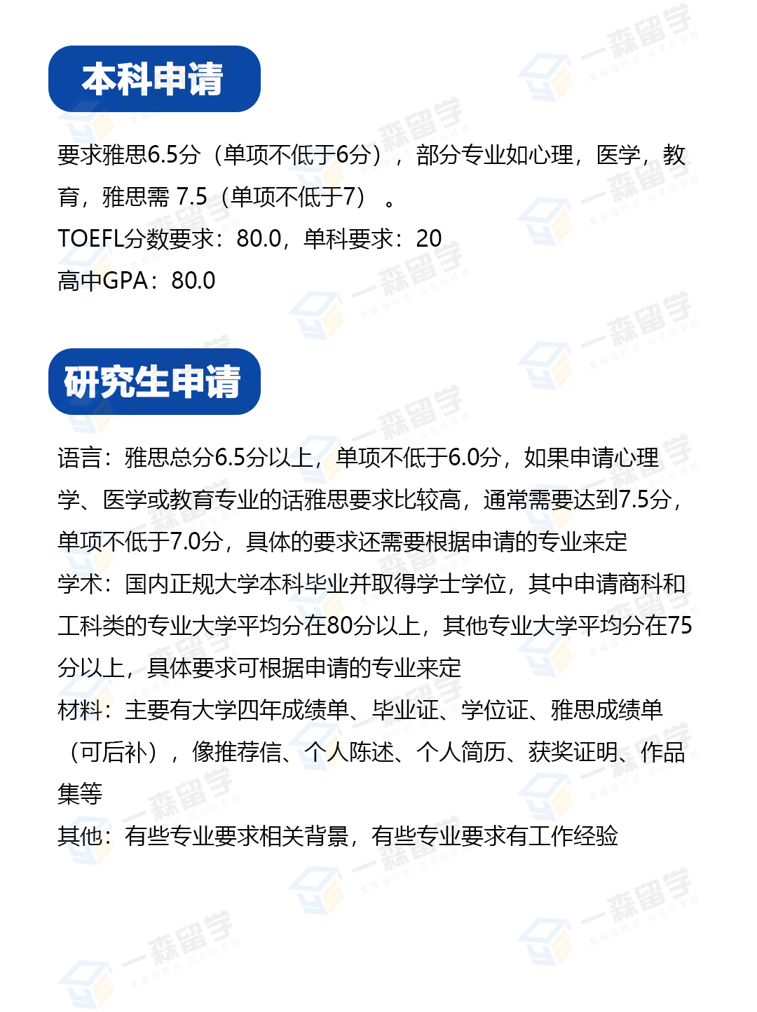 本科申请 要求雅思6.5分(单项不低于6分),部分专业如心理,医学,教育,雅思需 7.5(单项不低于7) TOEFL分数要求:80.0,单科要求:20 高中GPA:80.0 研究生申请 语言:雅思总分6.5分以上,单项不低于6.0分,如果申请心理学、医学或教育专业的话雅思要求比较高,通常需要达到7.5分,单项不低于7.0分,具体的要求还需要根据申请的专业来定 学术:国内正规大学本科毕业并取得学士学位,其中申请商科和工科类的专业大学平均分在80分以上,其他专业大学平均分在75分以上,具体要求可根据申请的专业来定 材料:主要有大学四年成绩单、毕业证、学位证、雅思成绩单(可后补),像推荐信、个人陈述、个人简历、获奖证明、作品集等 其他:有些专业要求相关背景,有些专业要求有工作经验