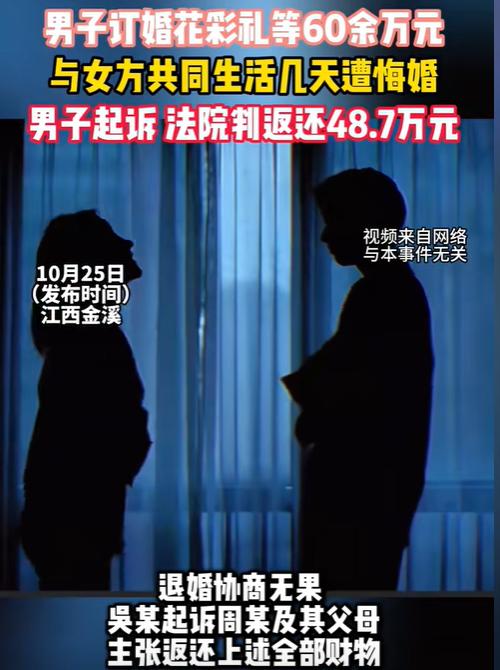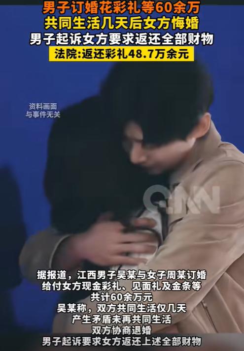 “这钱也太好挣了吧!”近日报道,江西抚州,男子为娶妻向女方支付60多万元彩礼等费用,可两人仅同居了4天,女方就明确表示不想结婚。男子无奈,便和女方商议退婚,然而,女方却只想退一半彩礼,男子当然不愿,一纸诉状将对方告上了法院,法院判了!   “我的六十万,就买了这四天的‘婚姻’?”这不是小说里的情节,而是发生在江西抚州,一桩被白纸黑字的判决书所认定的真实故事。   吴某实际月收入约7000元,在当下社会,这或许能支撑一个人的温饱,但若想迅速攒齐一笔足以“娶妻”的巨额彩礼,无异于痴人说梦。   为了尽快结婚,他不得不进行某种“包装”。于是,在女方面前,他的收入被模糊地描述为“一万多”。与此同时,他还有一笔未曾告诉周某的外债。他想着,等结了婚,一切都会好起来,这些暂时的困难都能被慢慢消化。   2025年3月5日,带着全家人的期望和举全家之力凑集的款项,吴某与周某订婚了。现金彩礼、见面礼、金饰……总计花费超过了60万元。   订婚后,吴某的父亲,或许认为自家付出了如此巨大的代价,便拥有了对新家庭规划的“话语权”,开始多次干涉两人的生活。最让女方难以接受的一点,是他提出要动用那笔高昂的彩礼钱,在婚前就给吴某开店。   在周某看来,这笔钱是给她和未来家庭的保障,如今却要立刻被男方家庭收回并支配,这让她感到自己不像是在结婚,反而有一种被算计的感觉。   直到一个月多后,她终于发现吴某的真实收入并非他之前所说的“一万多”,而是仅有7000元左右。同时,他那笔被隐瞒的外债也浮出了水面。   收入注水、存在外债、父亲强势干预并试图动用彩礼……所有这些因素叠加在一起,让周某对这段关系彻底失去了信心,直接回了自己家。   但在吴某看来,自己是彻头彻尾的受害者。他付出了几乎全部,却只换来四天的“婚姻”,他人财两空,坚持要求全额返还那60万。   周某却认为自己是在被欺骗和不当压力下,才做出了退婚的决定,因此自身并无过错。在她看来,返还50%的彩礼,已是仁至义尽。   一边是男方的愤怒与“冤屈”,另一边是女方的被骗感与“正当”防卫。法院仔细审理了双方的说辞和证据,并没有支持周某“返还50%”的主张,而是在仔细分析哪些算彩礼必须还,哪些算人情往来不必还后,判决女方返还48.7万,差不多是认定彩礼总额的90%。   这个数字既承认那4天共同生活的存在,更明确了婚姻不是计时收费的钟点房。   对于这个结果,有人说男方太心急,有人骂女方太心狠,还有人说彩礼这本是美好寓意的传统习俗,在某些人手里却变成了讨价还价的生意经。那么,大家是怎么看的呢?欢迎在评论区留言讨论。   信源: 羊城晚报——男子订婚给付女方彩礼等60余万元,共同生活几天后遭悔婚……法院判了→   文│一阳 编辑│史叔