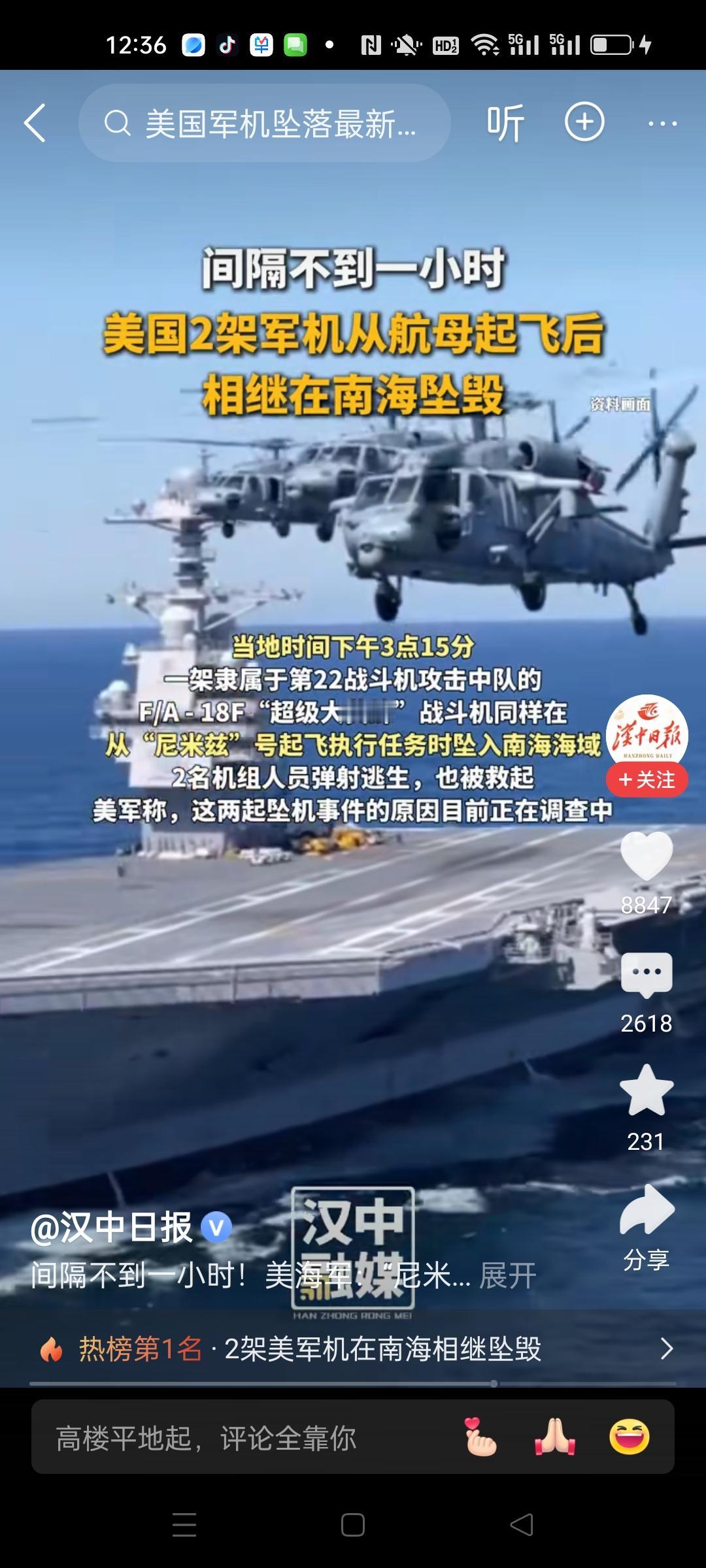 好消息,间隔不到一小时,美军两架战机在航母尼米兹号起飞后坠海。飞行员弹射逃生后被救起。 一架直升机,一架超级大黄蜂战斗机就这么葬身南海,这就是频繁到我们国家秀肌肉的代价。 老美打着航行自由的旗帜,在南海制造紧张气氛有啥用,不过是赔了夫人又折兵。美国仗着有10艘航母横行霸道,不过是我们东风快递的活靶子。 美国佬赶紧回去吧,不然连航母都保不住,我说的。