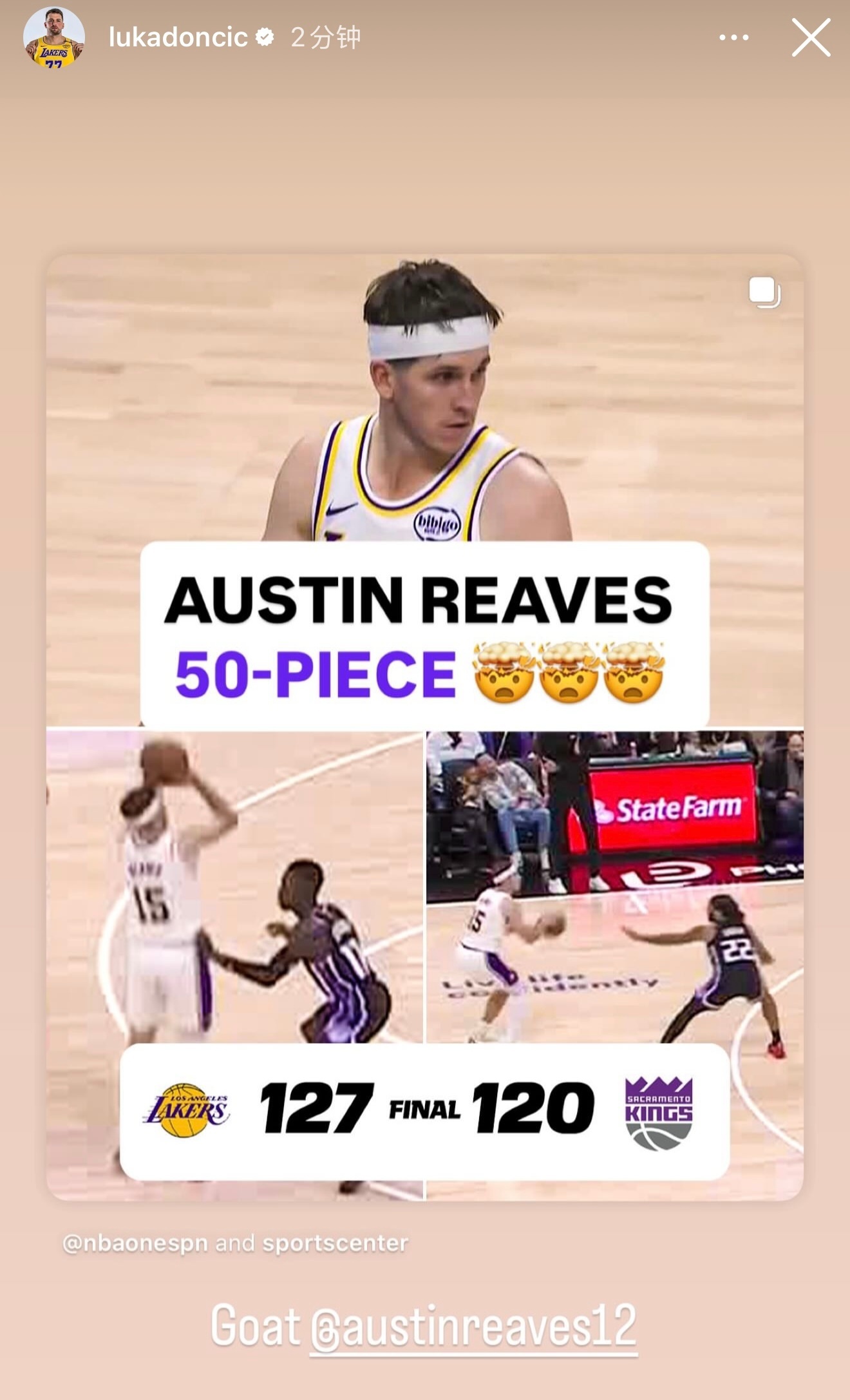 东契奇更新社媒:里夫斯,GOAT!!!!湖人vs国王里夫斯51分